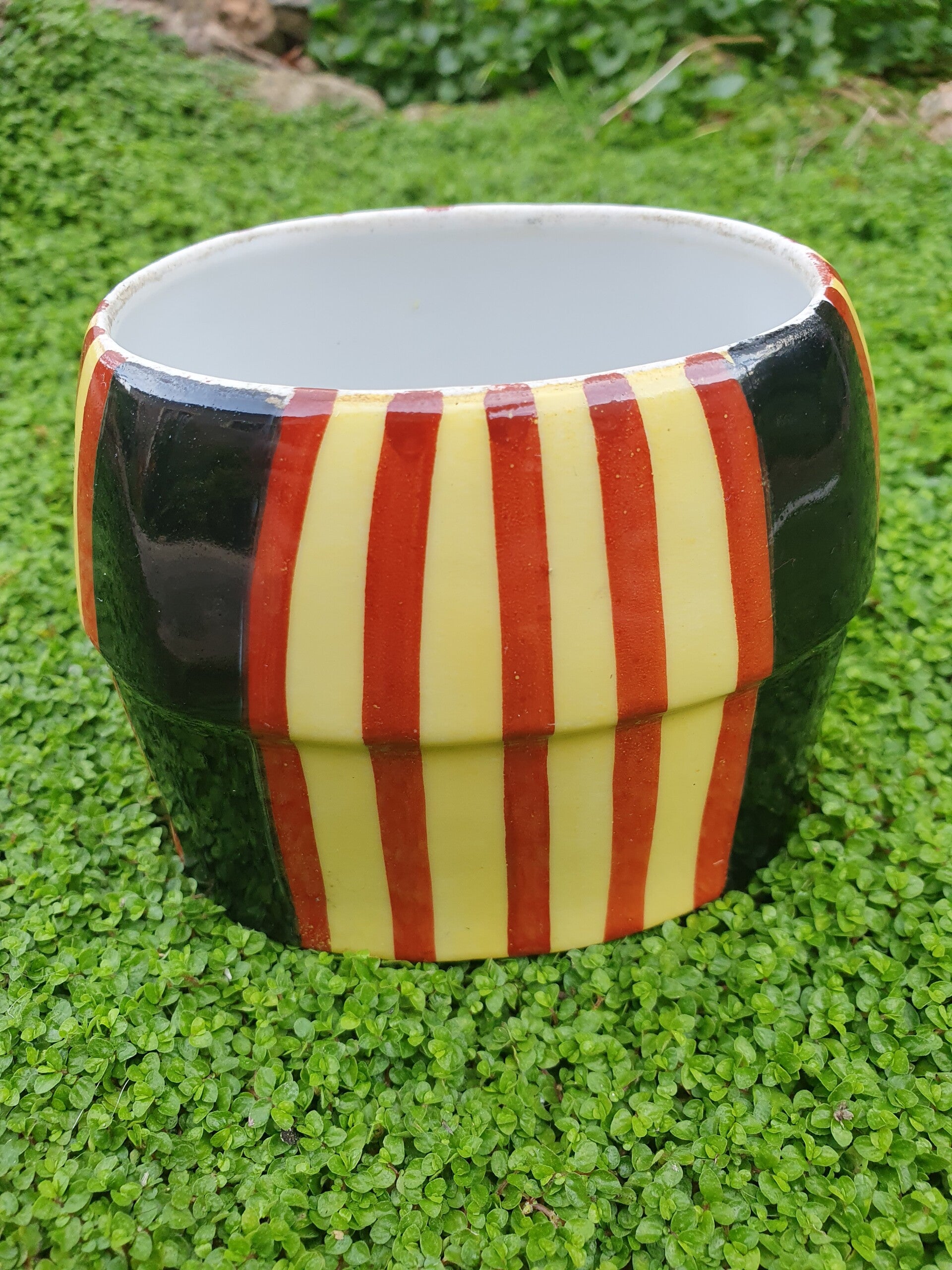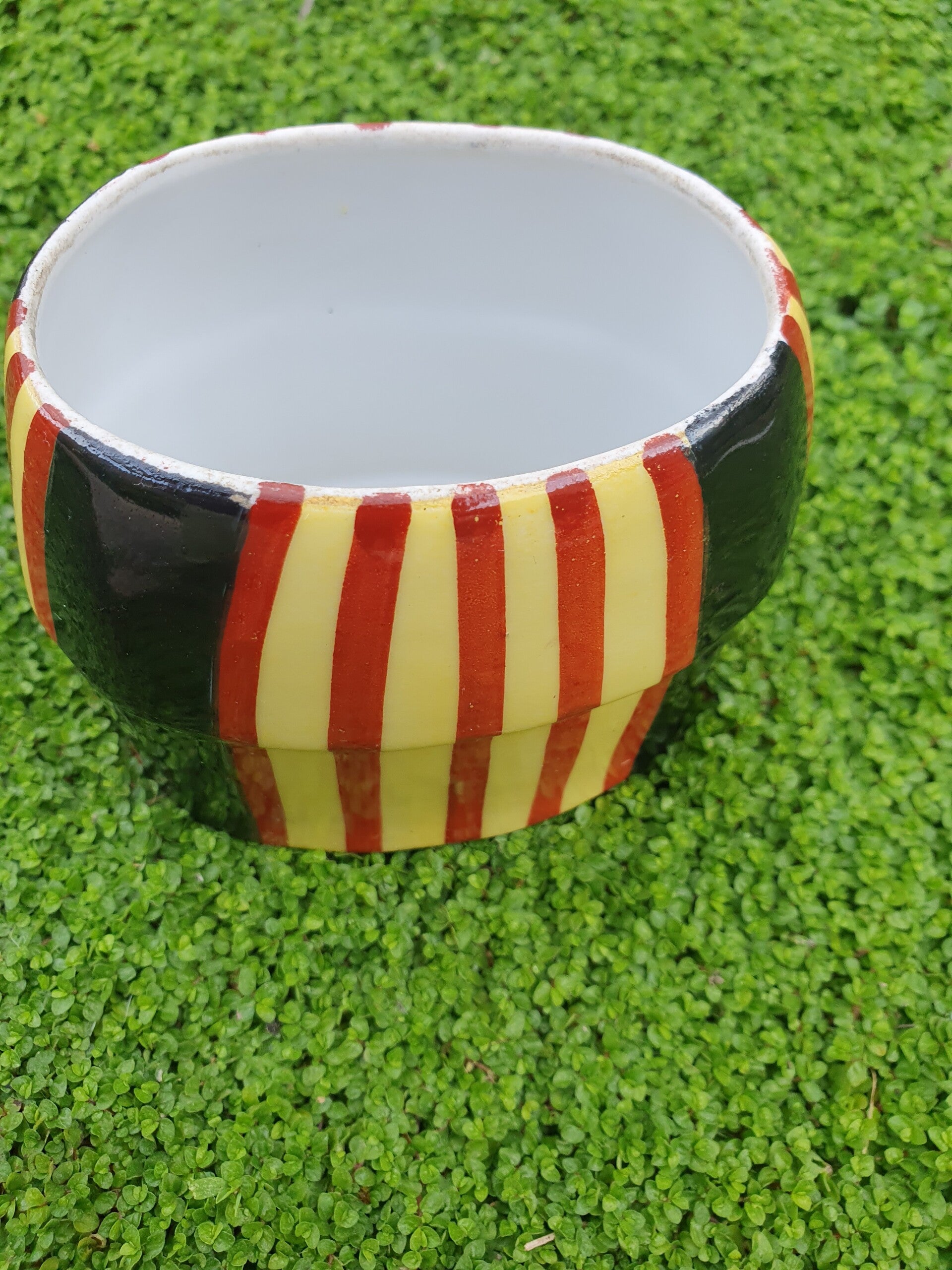 Vintage ovaal vaasje in rood, geel en zwart gestreept, gemerkt Limoges France en met nummer 8.