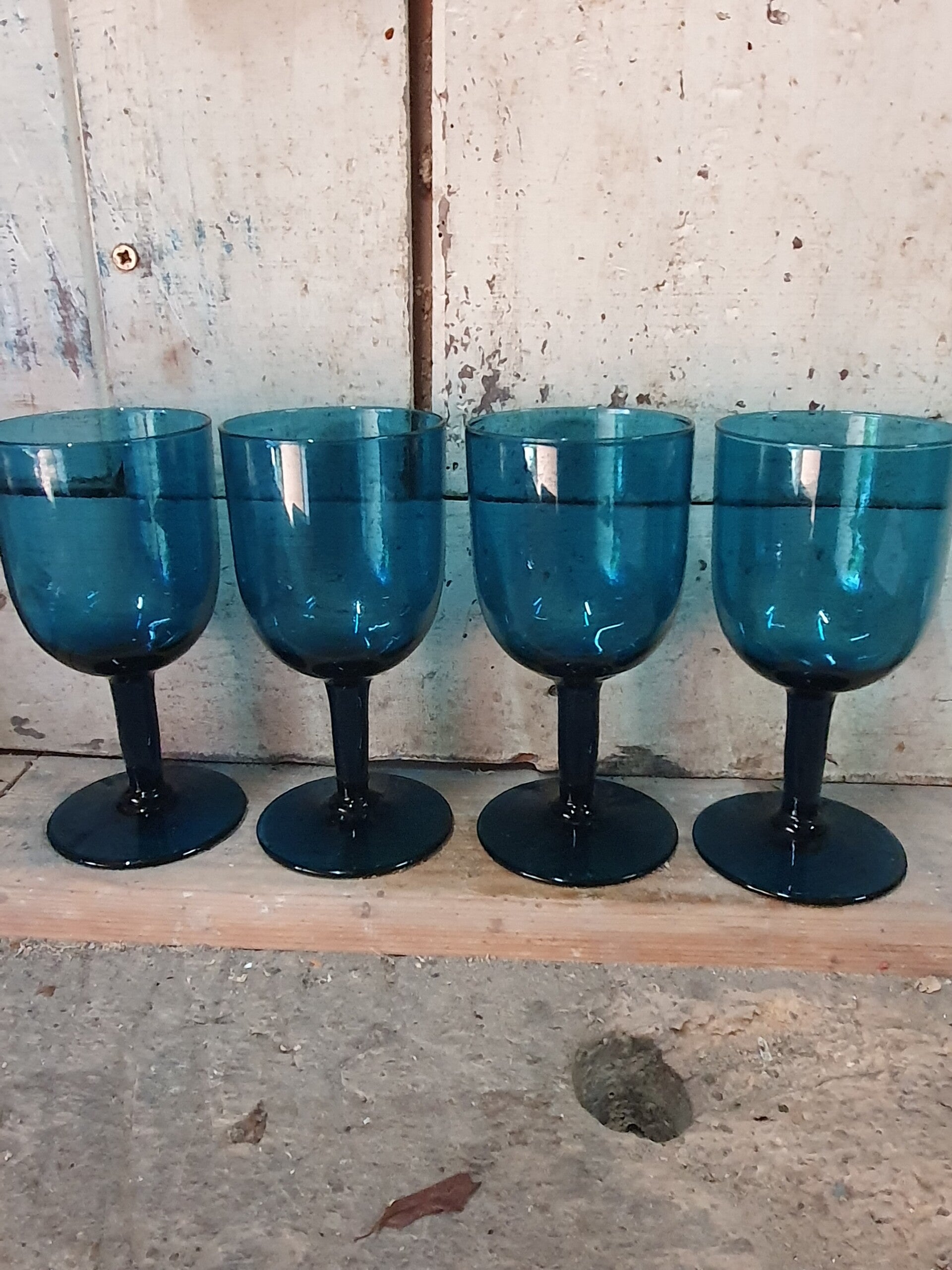 4 Pauwgroene wijnglazen, een strak model van 13 cm hoog en 6,5 cm doorsnede.