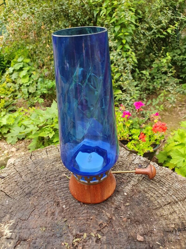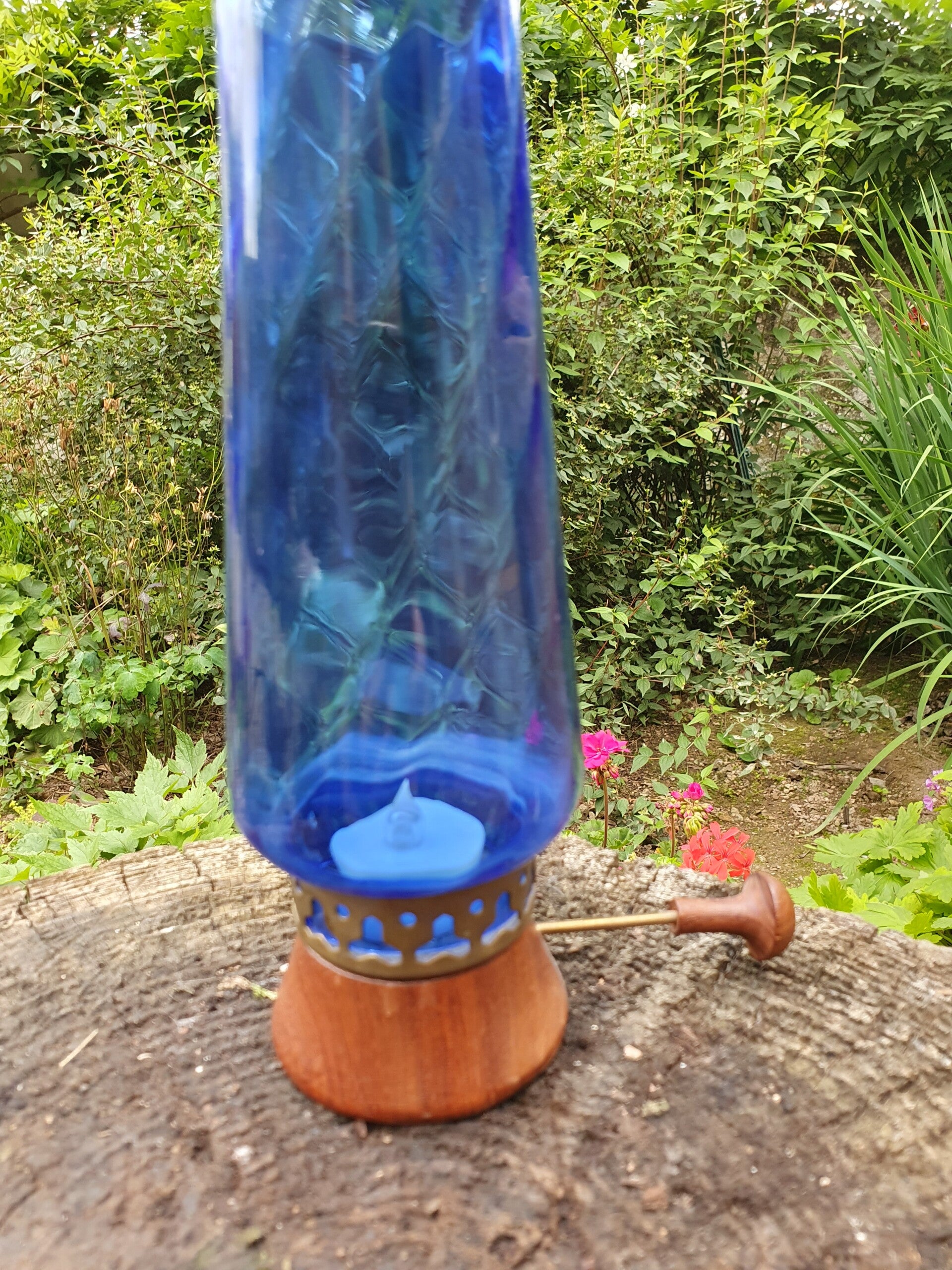 Een lanmp van blauw glas op een houten voet, geschikt voor een waxine lichtje.
