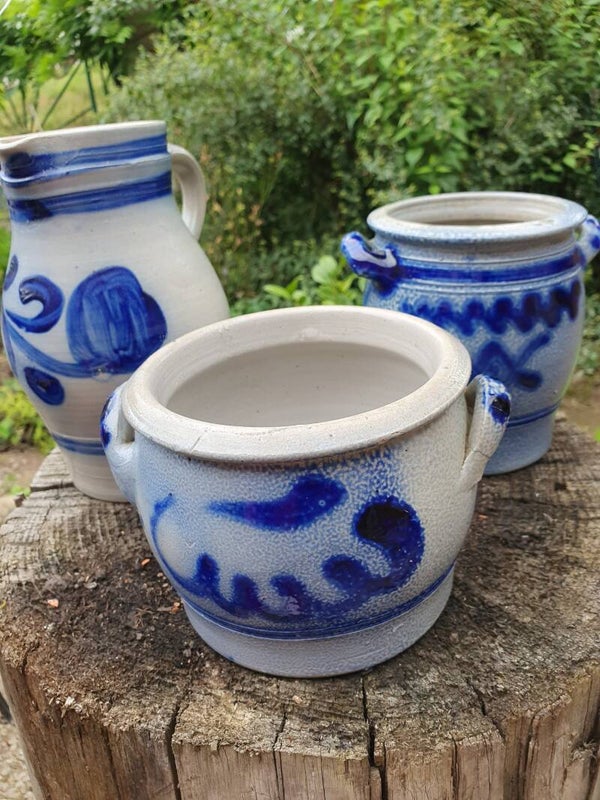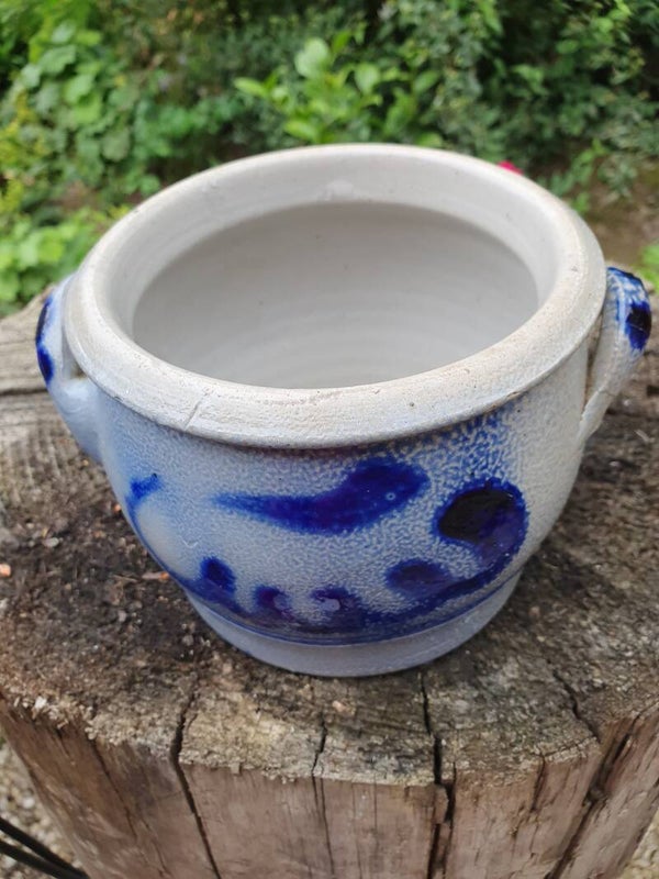 Lage zoutpot van Keuls aardewerk van 11 cm hoog en met een diameter van 14 cm. Leuk met een geranium erin!