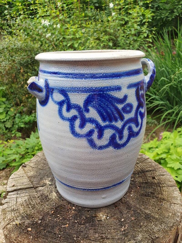 Hoge pot van Keuls aardewerk van 27 cm hoog met een doorsnede van 18 cm. 1 oor is stuk. Speciale prijs.