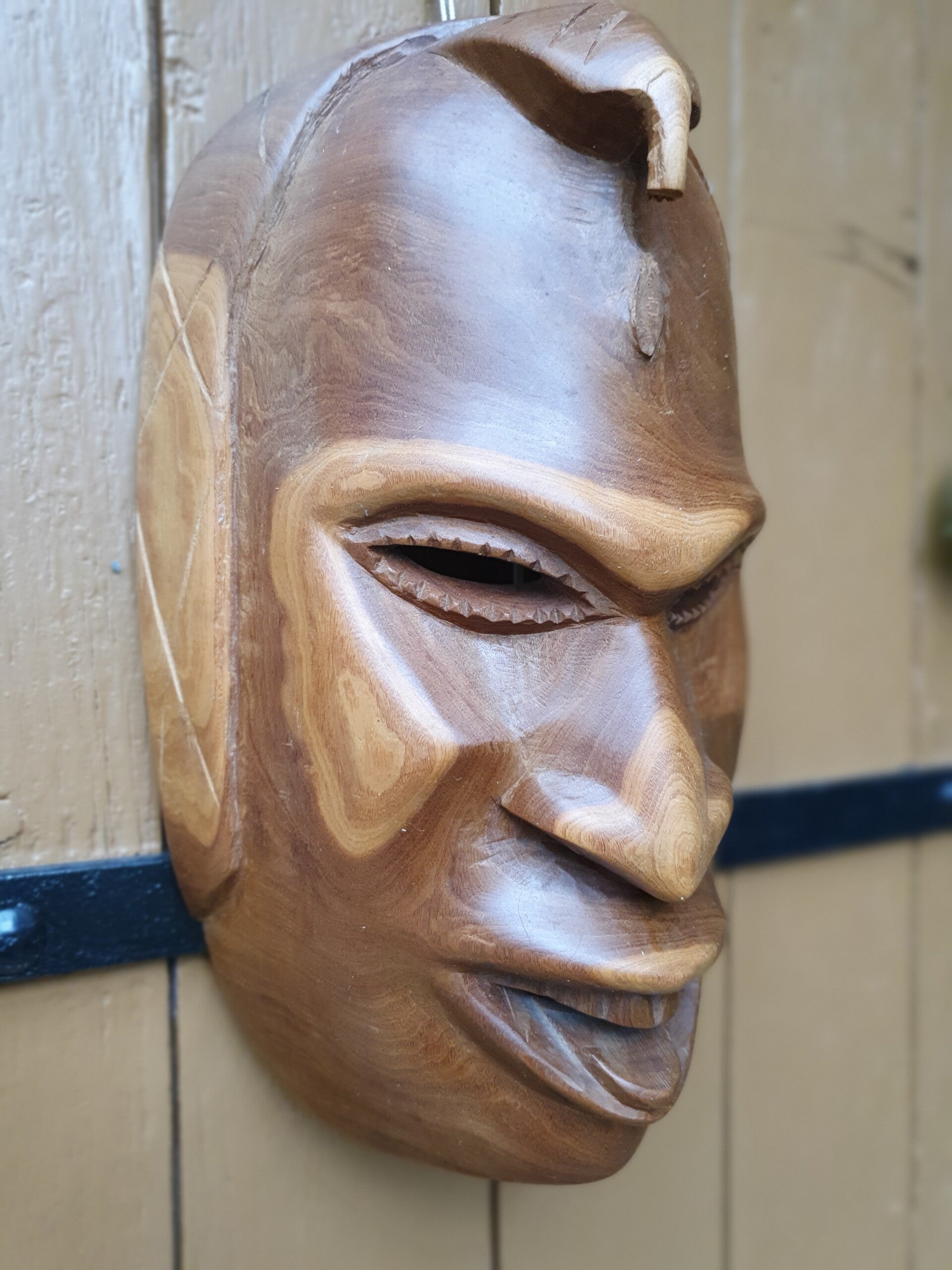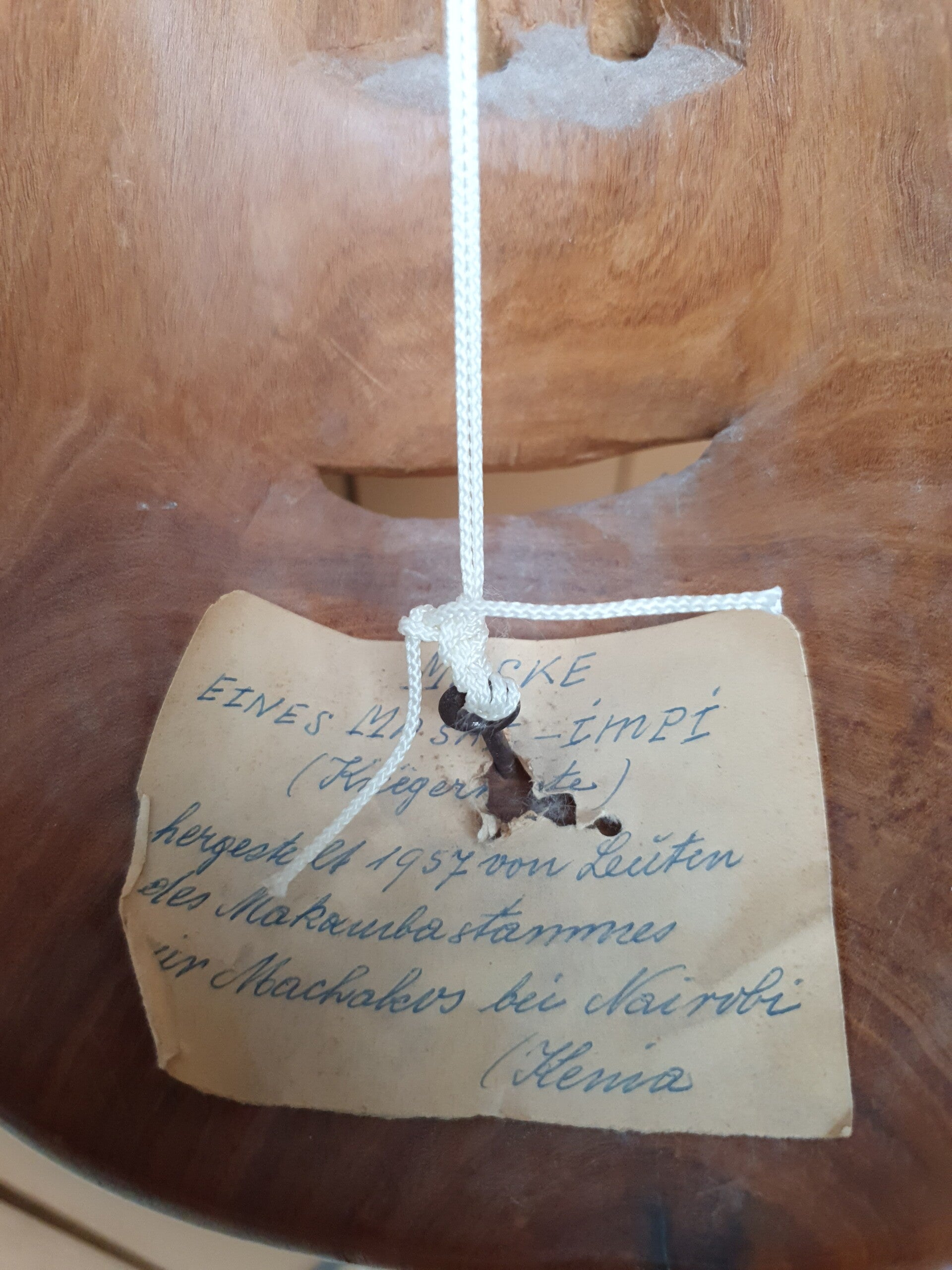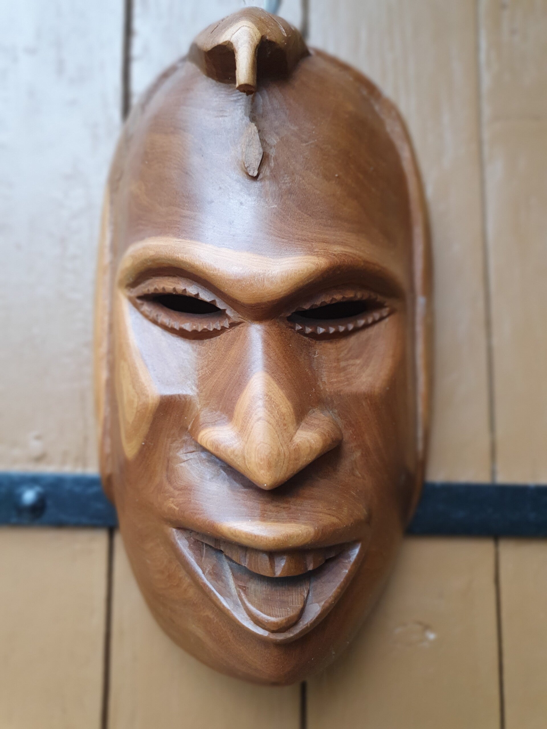 Houten masker uit Kenia, in 1957 gemaakt door mensen van de Makumba stam Machakos biij Nairobi, Kenia, zoals een label in het masker vermeld.