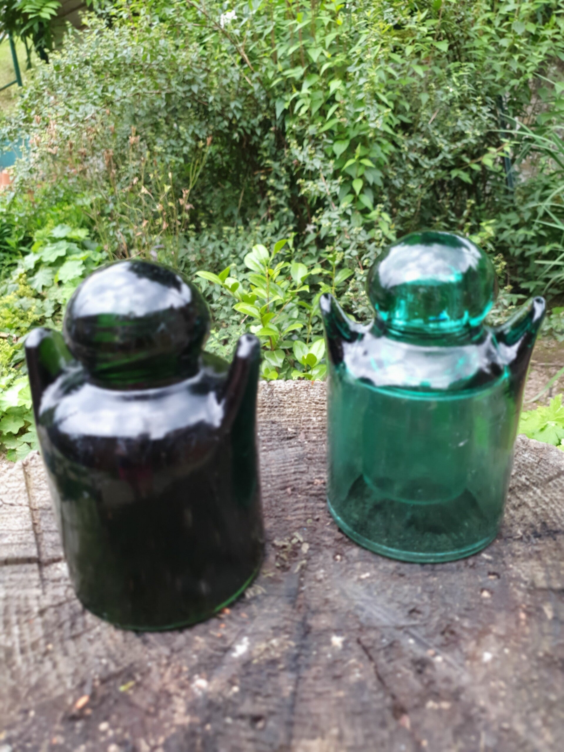 Vintage. Industrieel. Isolator van donkergroen glas van het merk L'Electro Verre 35/1. Op de foto links.