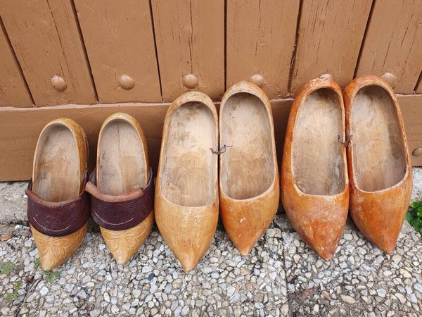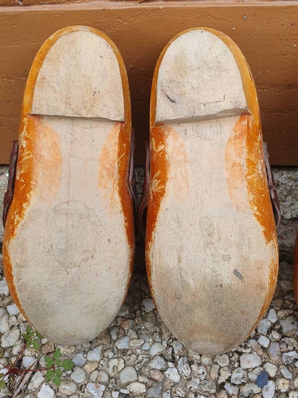 Oude Franse klompen afgezet met leer met nog vaag de naam Martine in potlood aan de binnenkant. Maat 35.