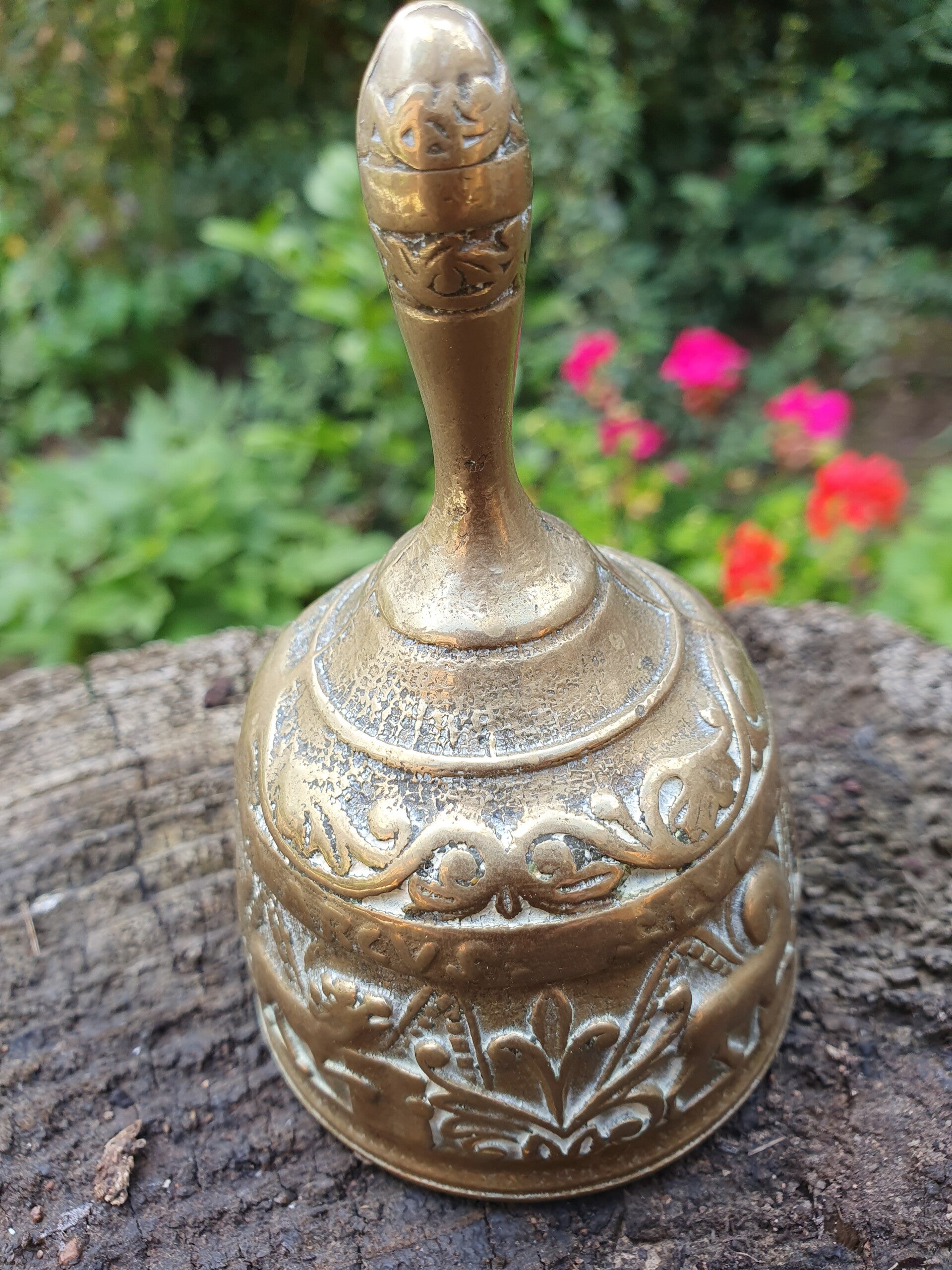 Tafelbel van brons met gestilleerde bloem en dierfiguren en de namen "Johannes, Matheus, Marcus en Lucas".