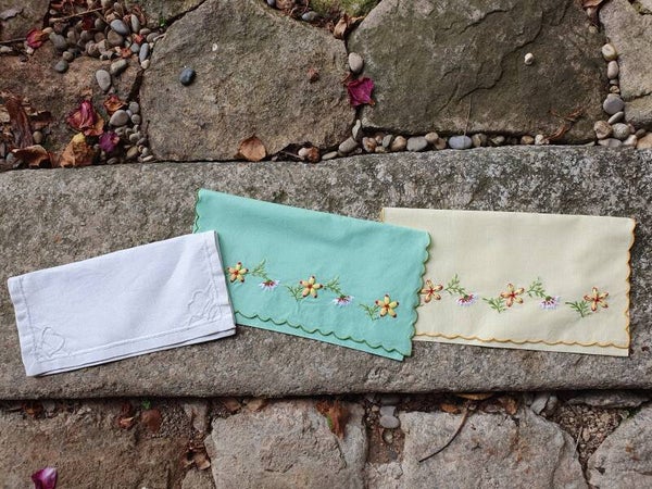 Vintage lichtgeel enveloptasje voor servetten of zakdoekjes, fraai geborduurd.