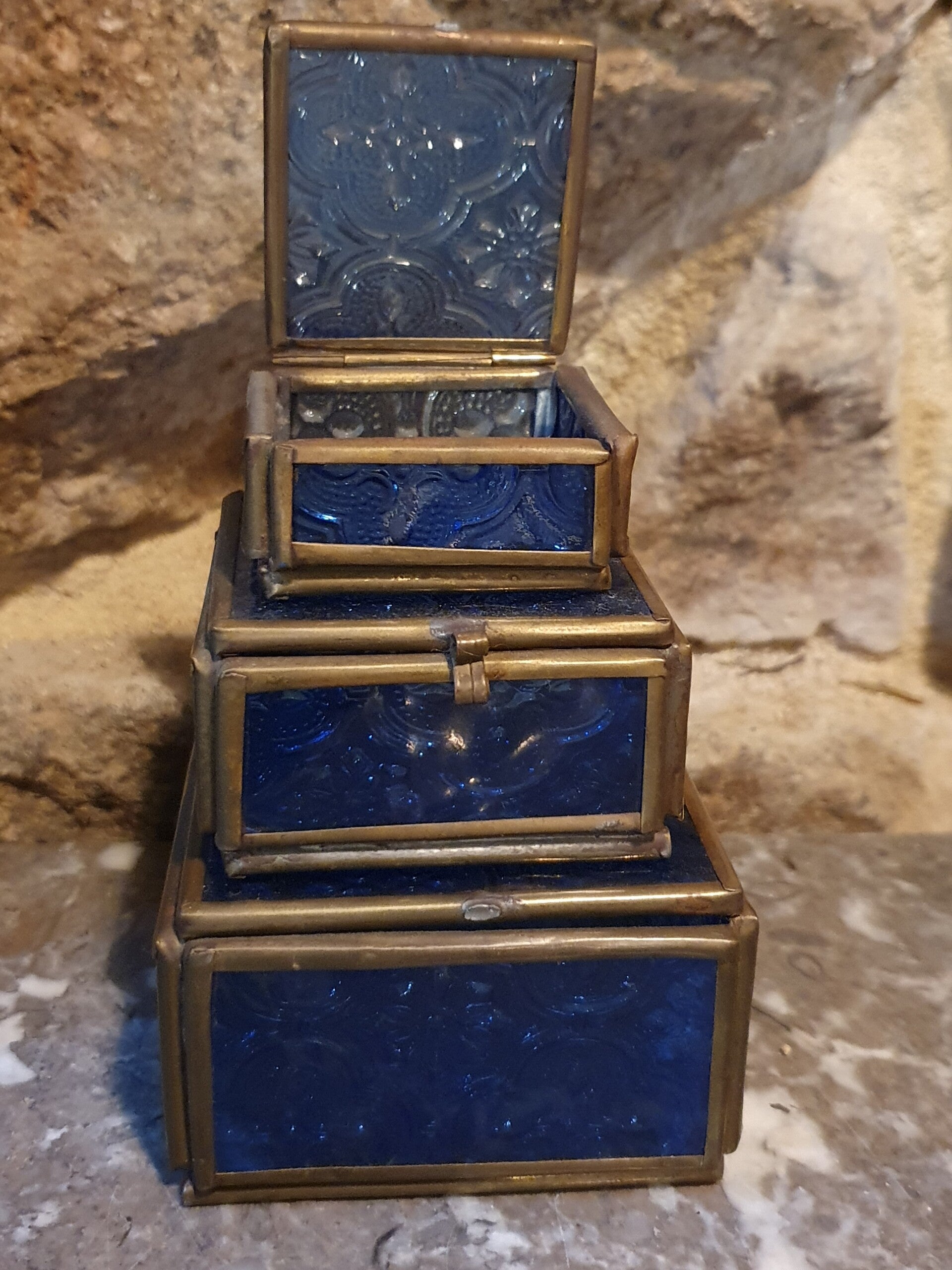 Set van 3 in elkaar passende doosjes van blauw glas, afgezet met messing. Van 2 doosjes is de sluiting defect.