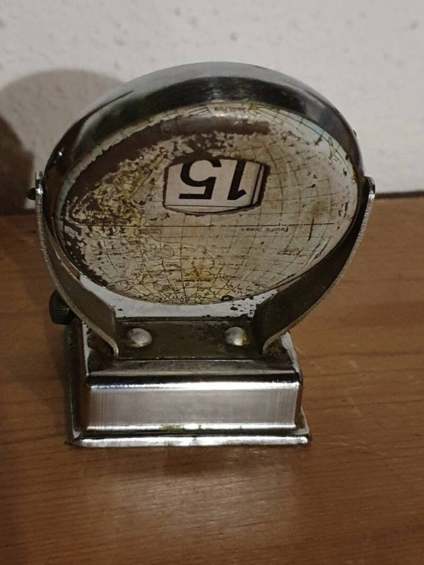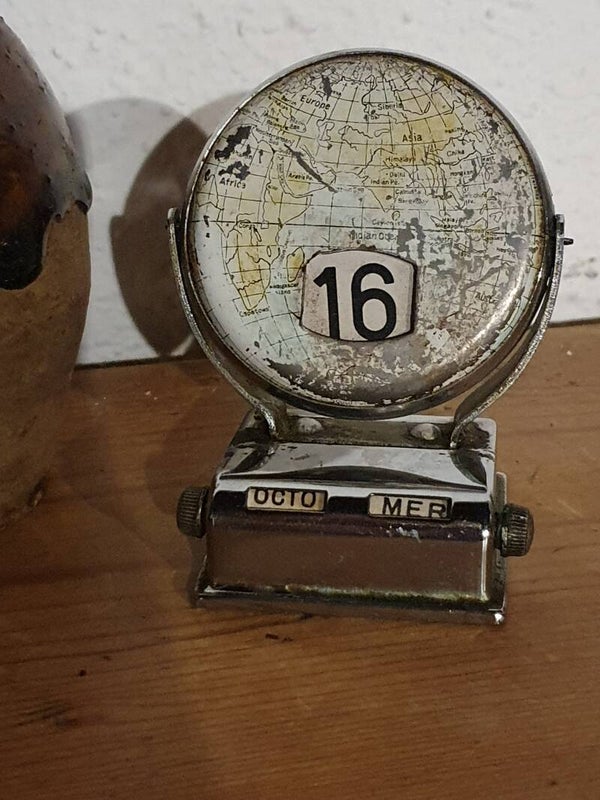 Antieke eeuwige kalender uit 1908 met afbeedingen van de wereldbol.