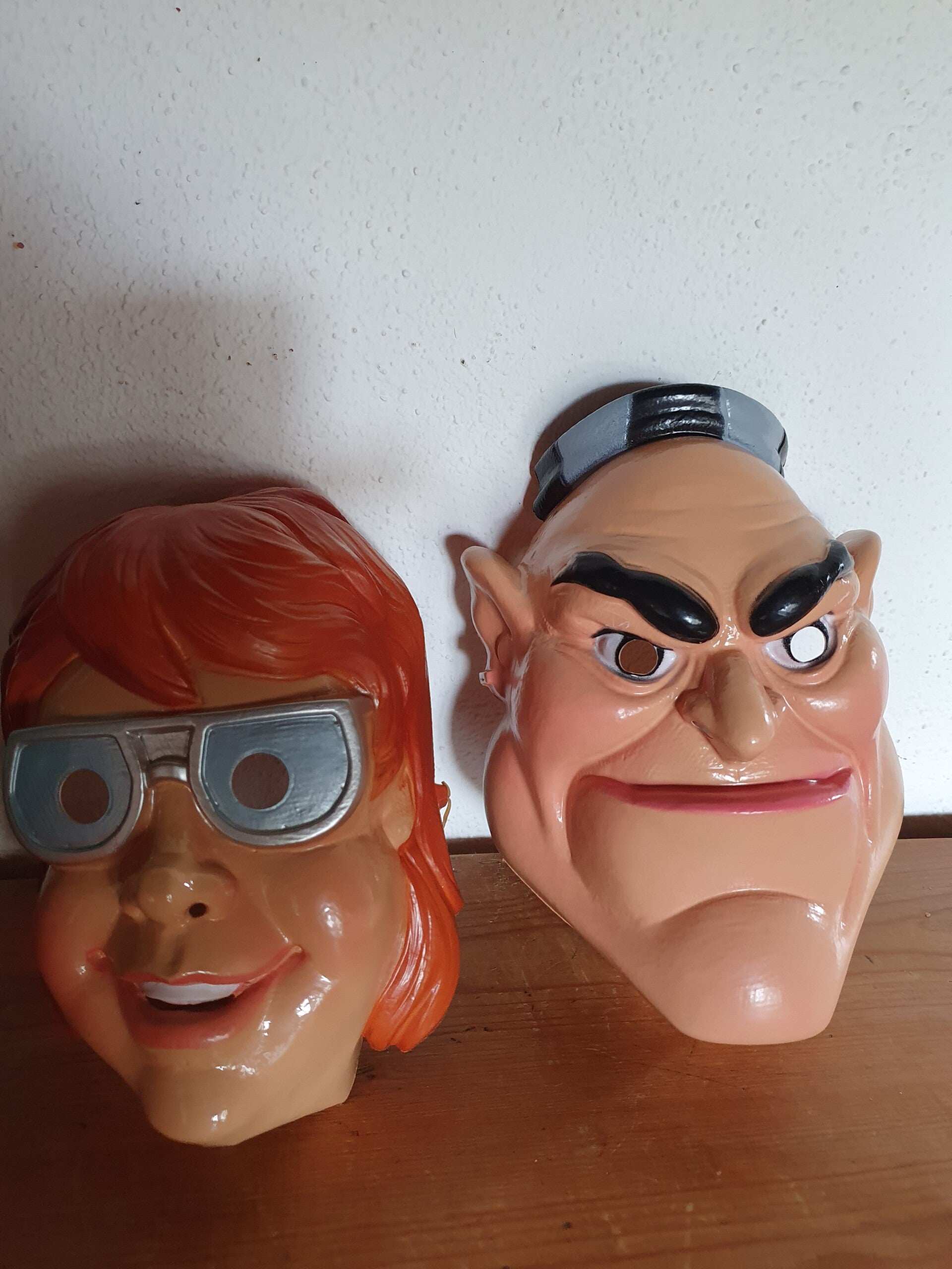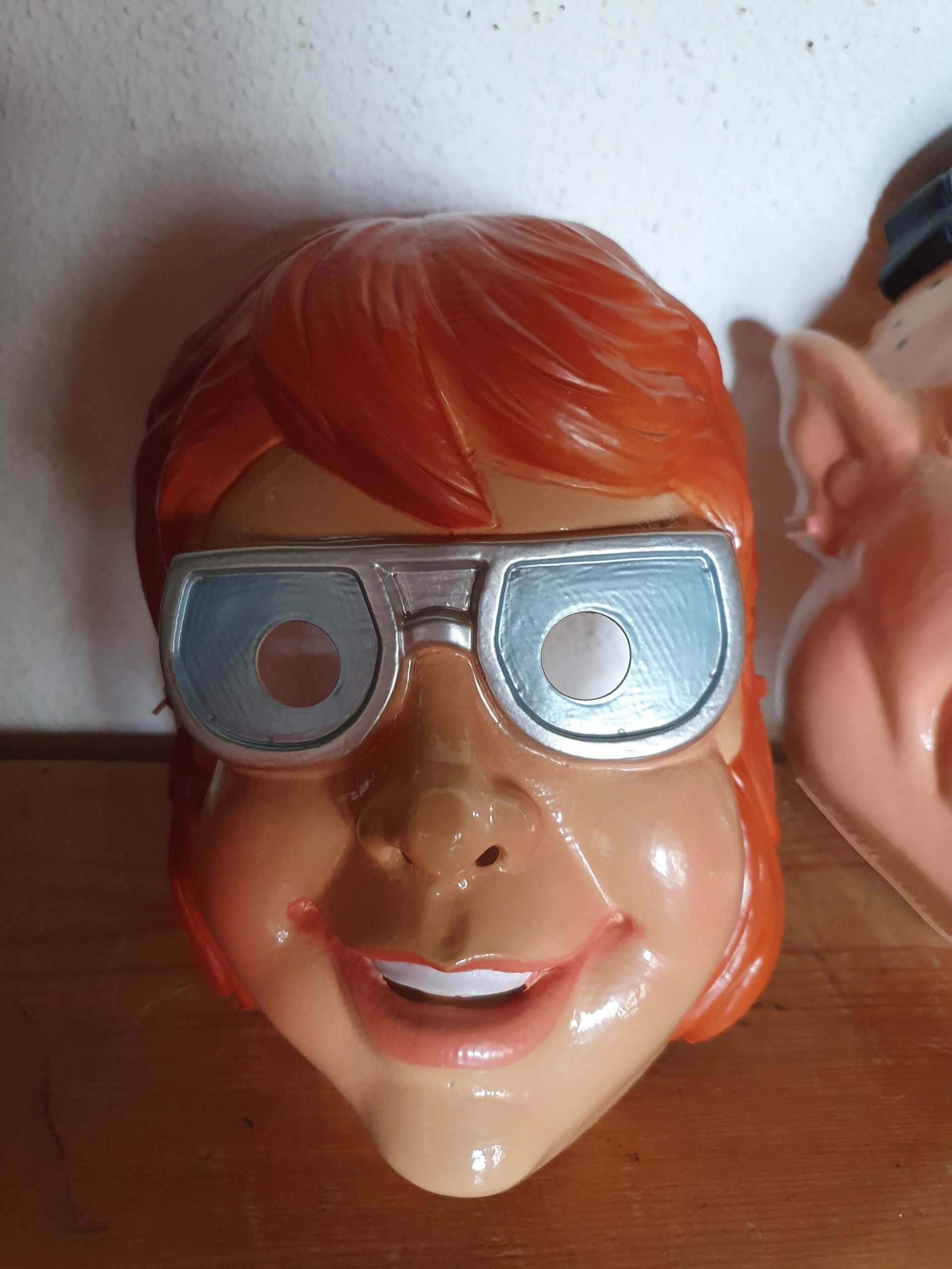 Antiek masker van het merk Cesar 1989 en het jaartal 1988. Het masker heeft een aantal kleine scheurtjes, die met plakband geplakt zijn.