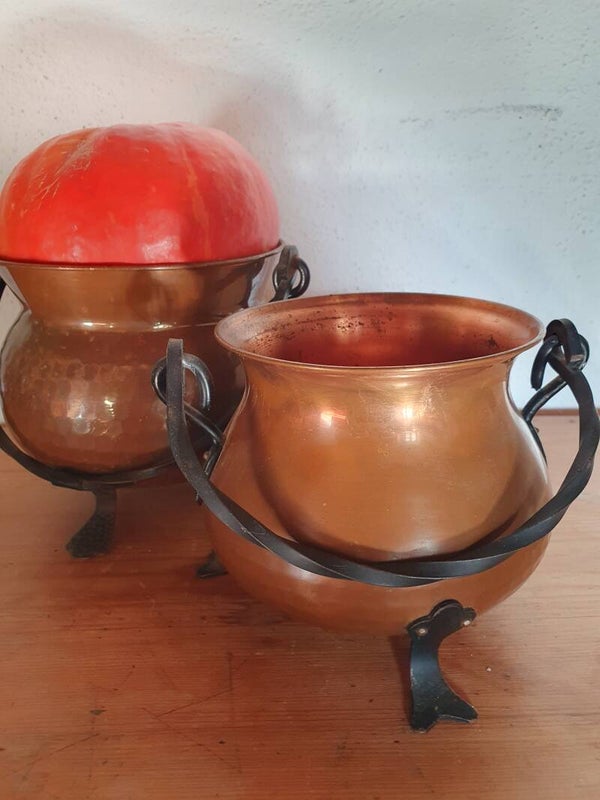 Rood koperen heksenpot op zwarte pootjes en met eenzwart hengsel.