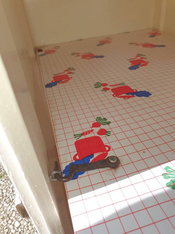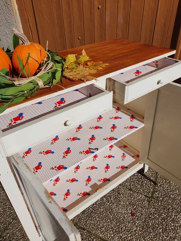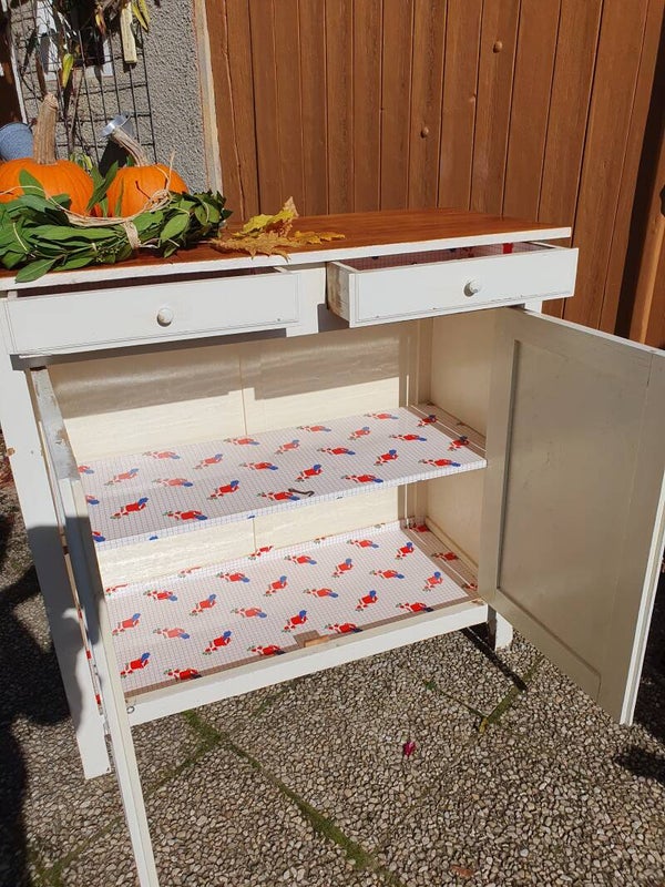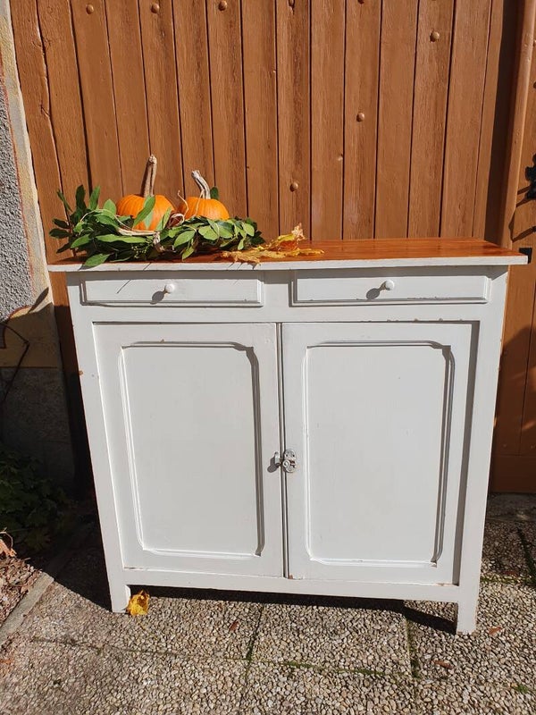 Handige brocante kast met 2 laden, 2 deuren en een legplank. De kast is wit met een gebeitst bovenblad. Het bovenblad is 105,5 cm breed x 99,5 cm hoog x 44 cm diep. Één achterpoot moet gerepareerd worden; heeft in het vocht gestaan.