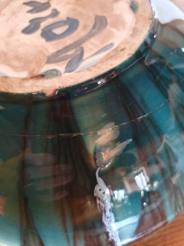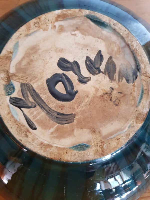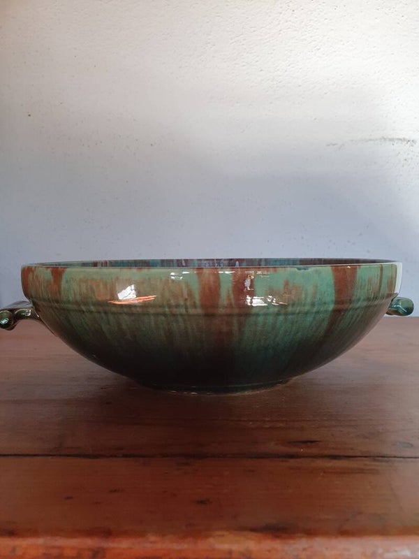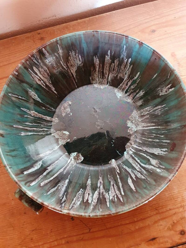 Typische schaal van Morvans aardewerk in de kleuren, turquoise, groen en bruin. Helaas heeft de schaal schade, maar is nog steeds goed bruikbaar als bijvoorbeeld fruitschaal.