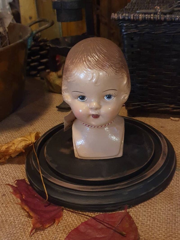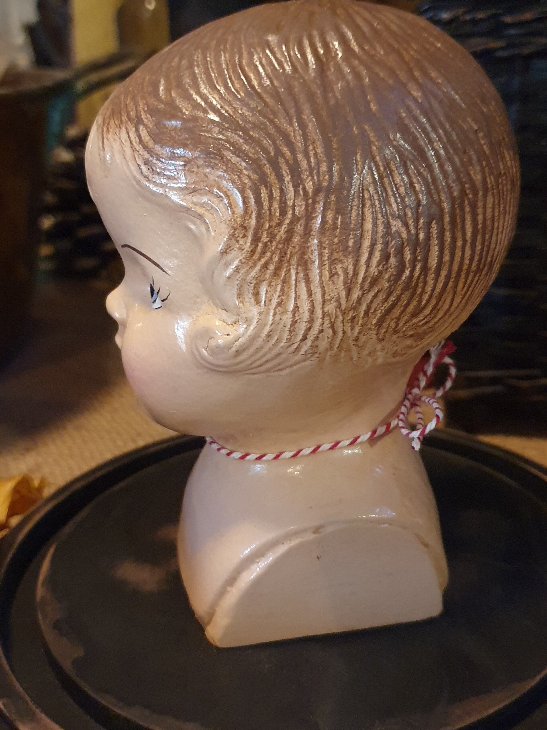 Nostalgisch poppenkopje, vroeger gemaakt om poppen te maken, nu een gewilde decoratie. Gemaakt van kunsthars, hoogte ca. 13 cm. Nieuw brocante.