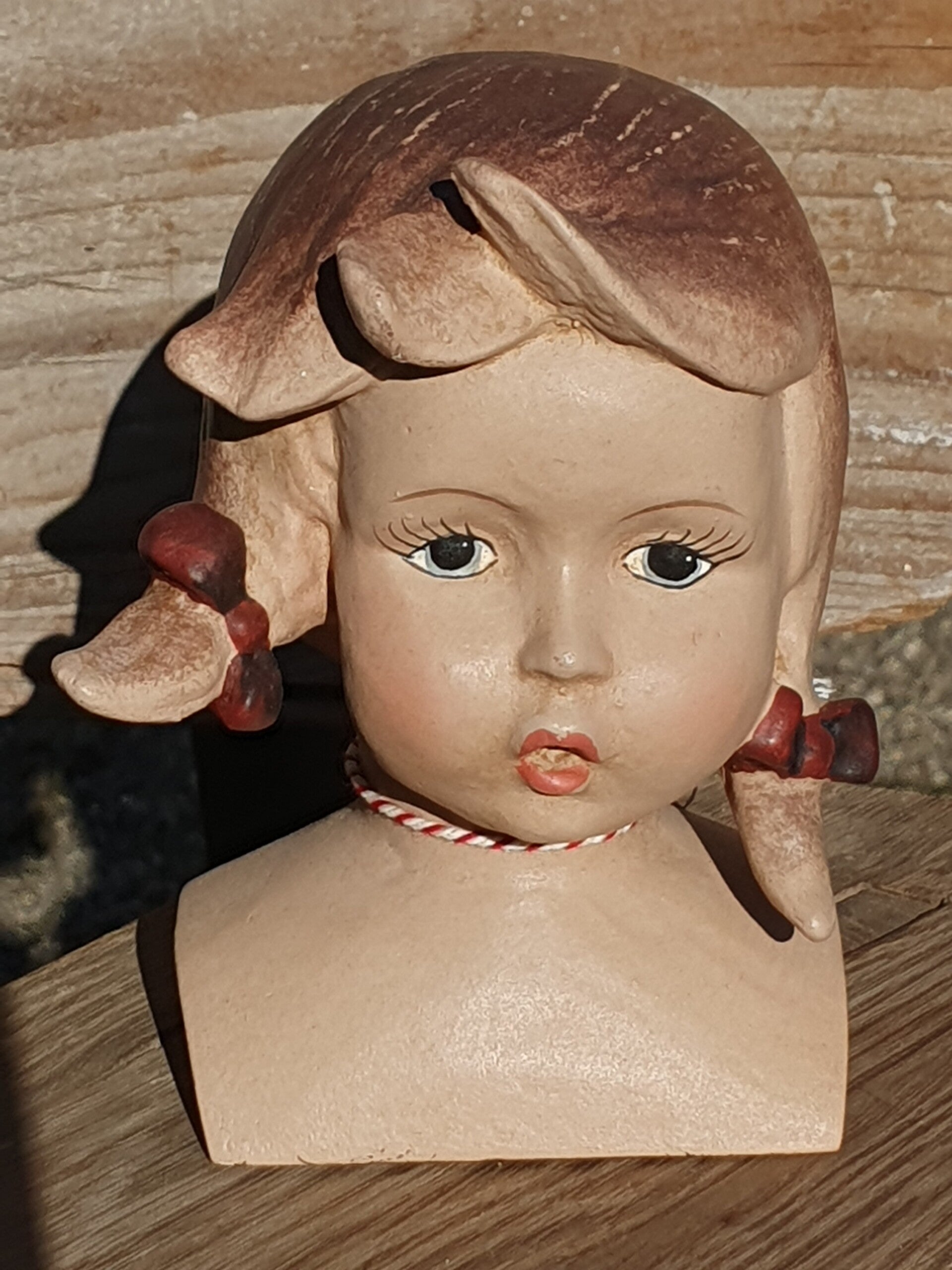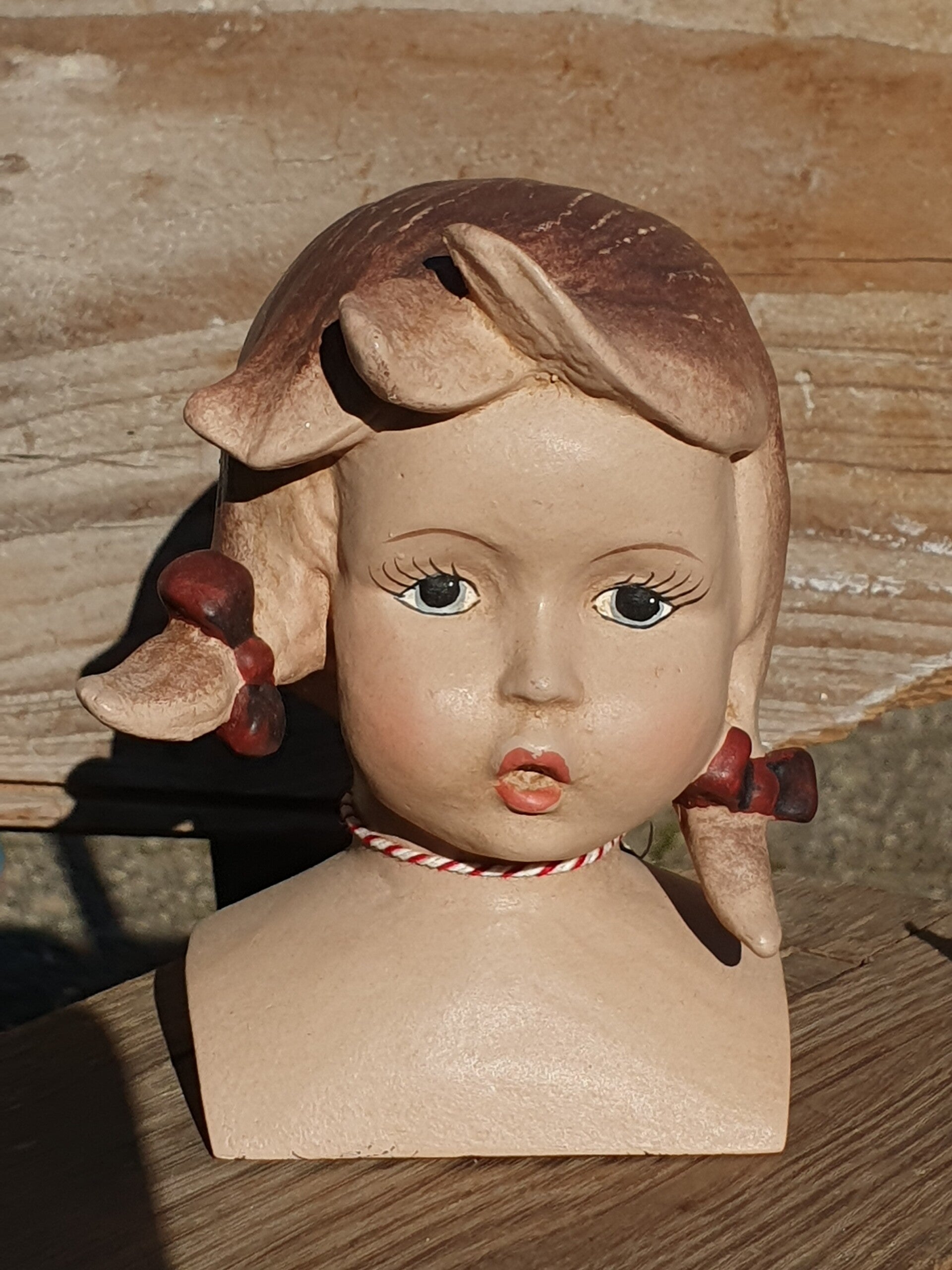Nostalgisch poppenkopje, Saartje et staartjes, naar een figuur van Hummel, vroeger gemaakt om poppen te maken, nu een gewilde decoratie. Gemaakt van kunsthars. Nieuw brocante.