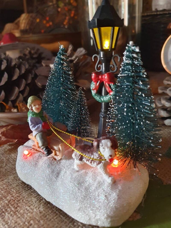 Kerst tafereel van een kind op de slee en dennebomen met verlichting op batterijen.