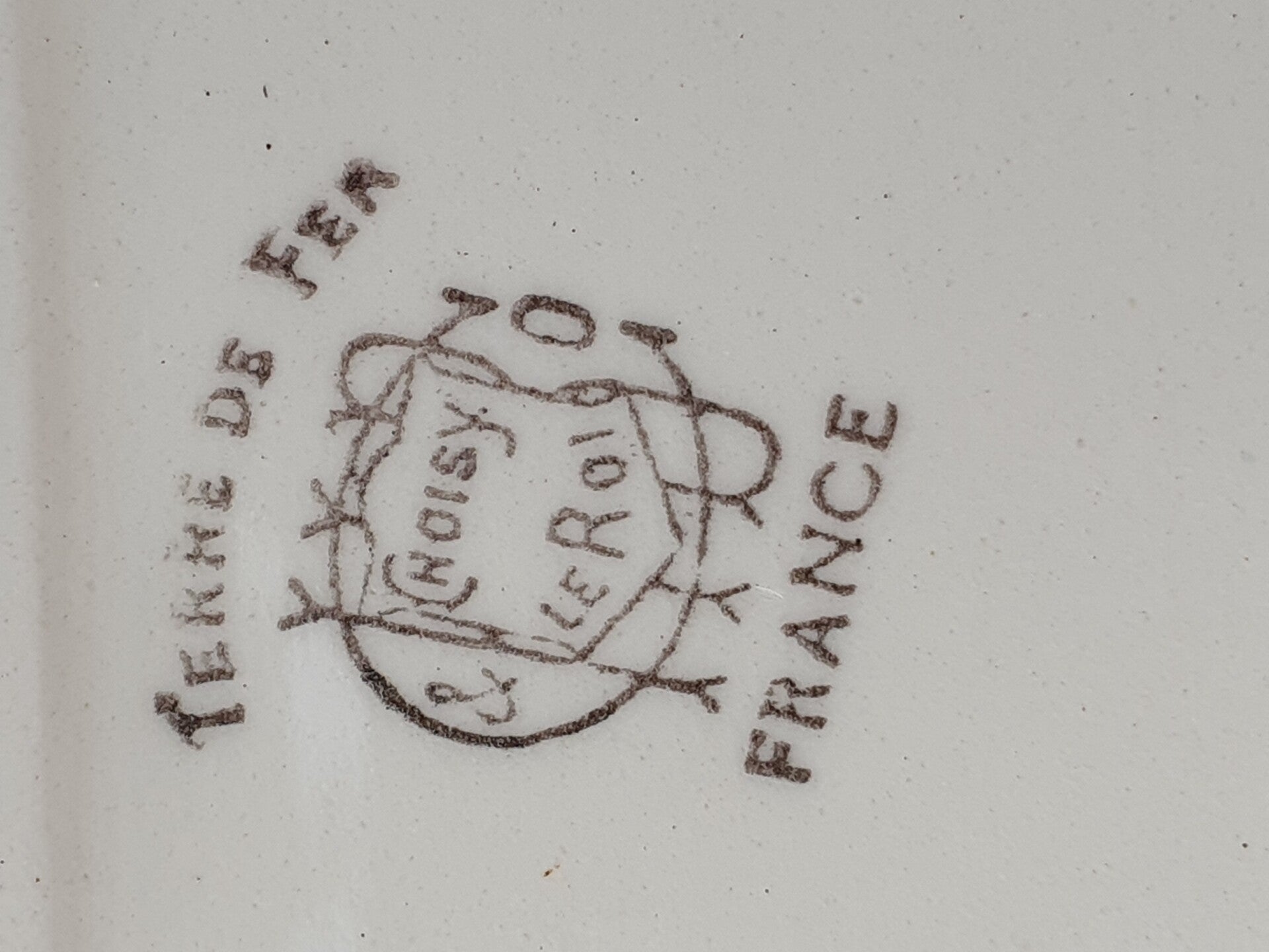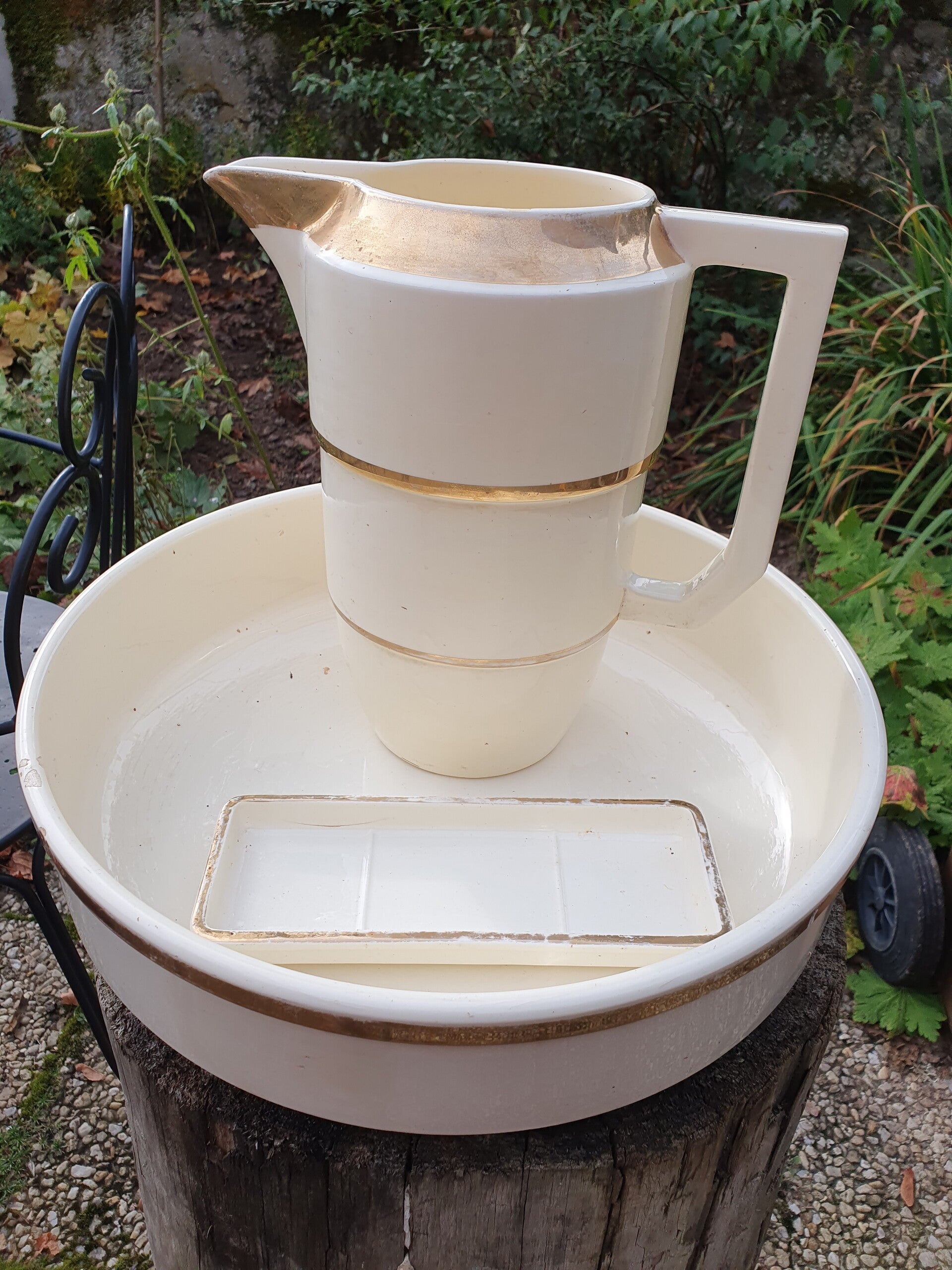 Lampetstel Terre de fer van Choisy le Roi France, bestaande uit een grote schaal, een grote kan en een kammen of zeepbakje in gebroken wit en gouden biezen uit ca. 1900 - 1930.