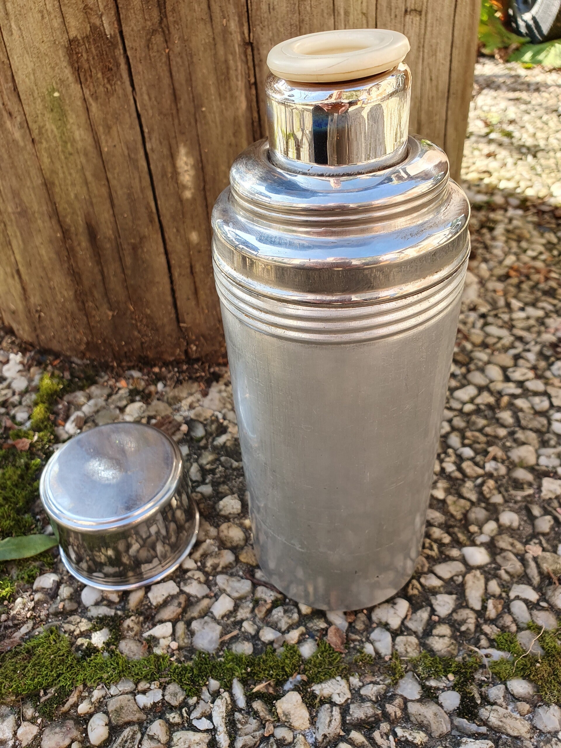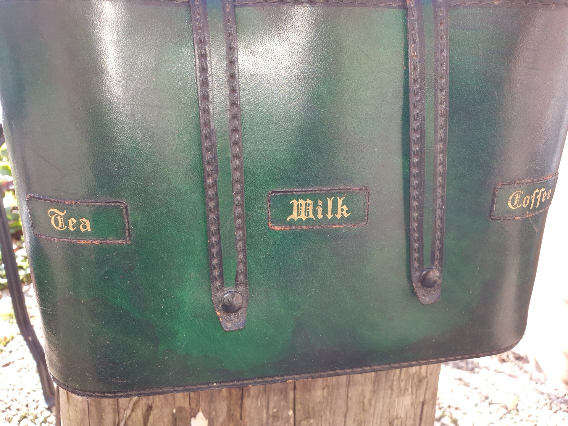 Bijzondere vintage set van 3 metalen thermosflessen in een foudraal met ophangbeugels en met het opschrift TEA, MILK en COFFEE.
