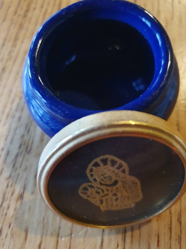 Bijoutiedoosje / pillendoosje / snuisterijendoosje met in de deksel een zeer fijn gekantkloste Maria met kind.