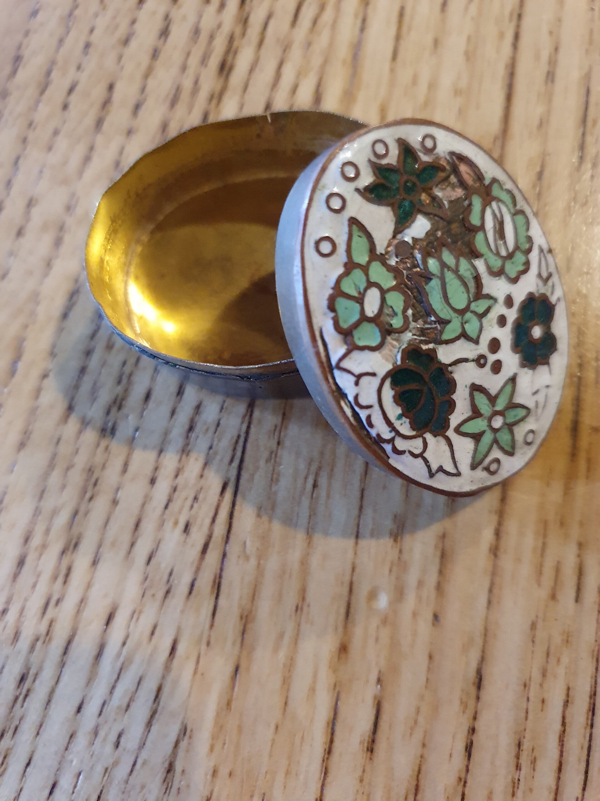 Antiek ovaal geëmailleerd bijoutiedoosje / pillendoosje / snuisterijendoosje van messing met een florale afbeelding in wit, licht- en donkergroen in emaille.