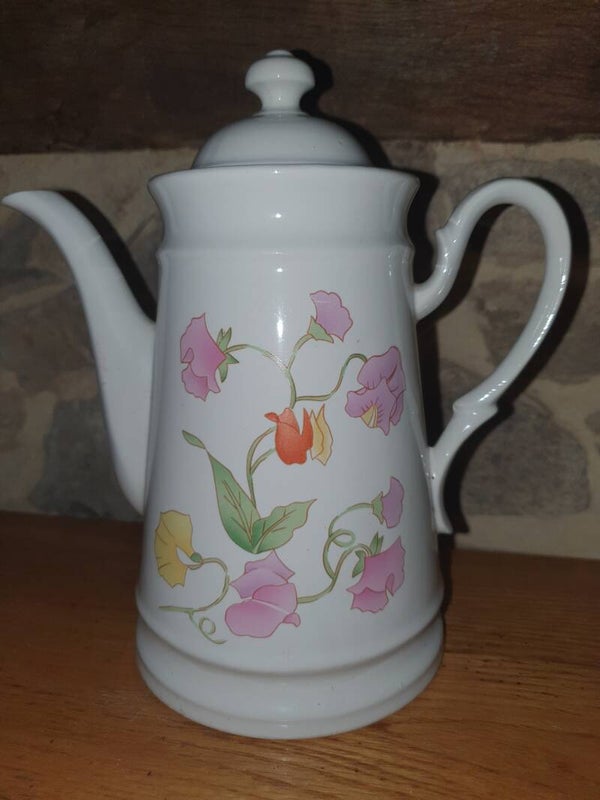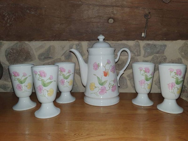 Vintage koffiepot met 5 bekers, allen met de afbeeldingen van Lathyrus, een fijn bloemetje wat ook nog lekker ruikt.