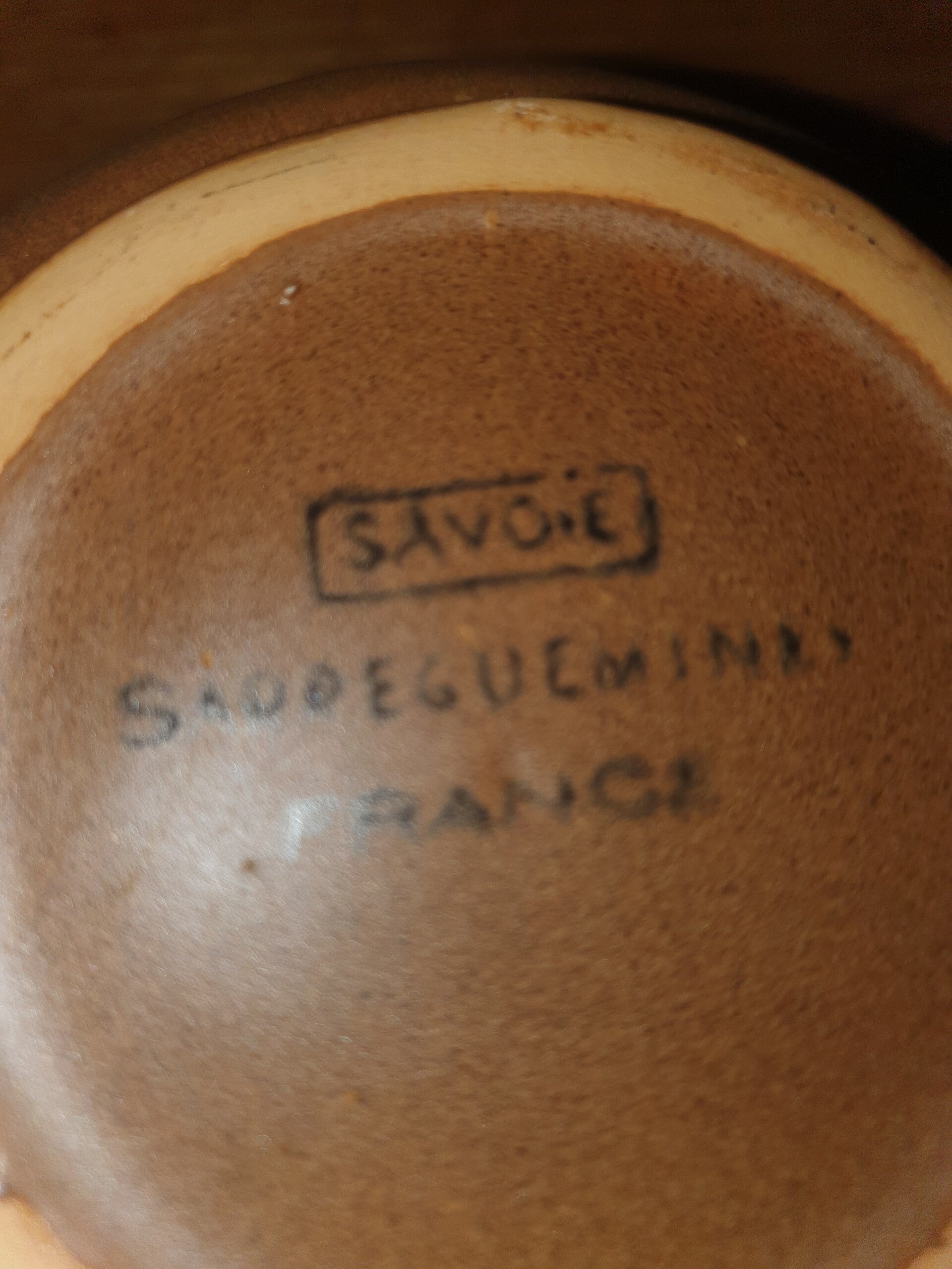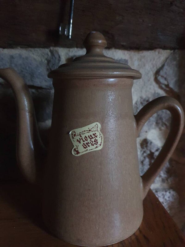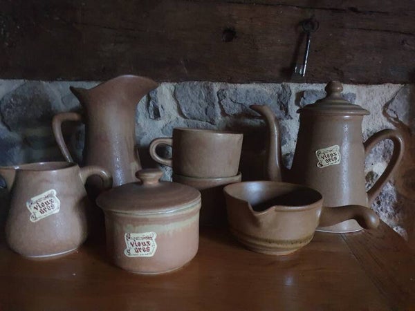 Mooie vondst, dit vintage servies Vieux Gres, serie Savoie van Sarreguimines France, bestaande uit een koffiepot, een waterkan, een suikerpot, melkkan, 2 koppen met oor en een schenkkom met steel.