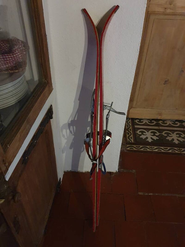 Brocante rode kinderski's van het merk Scheestern van 1 m lang. Bijzondere decoratie!