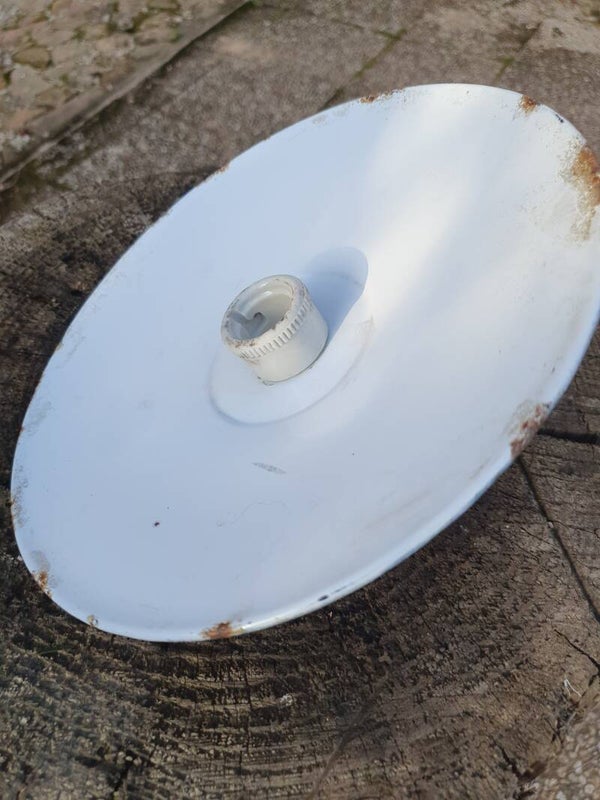 Leuk vintage emaille lampenkapje in resedagroen met de originele porseleinen fitting. Doorsnede 24 cm.