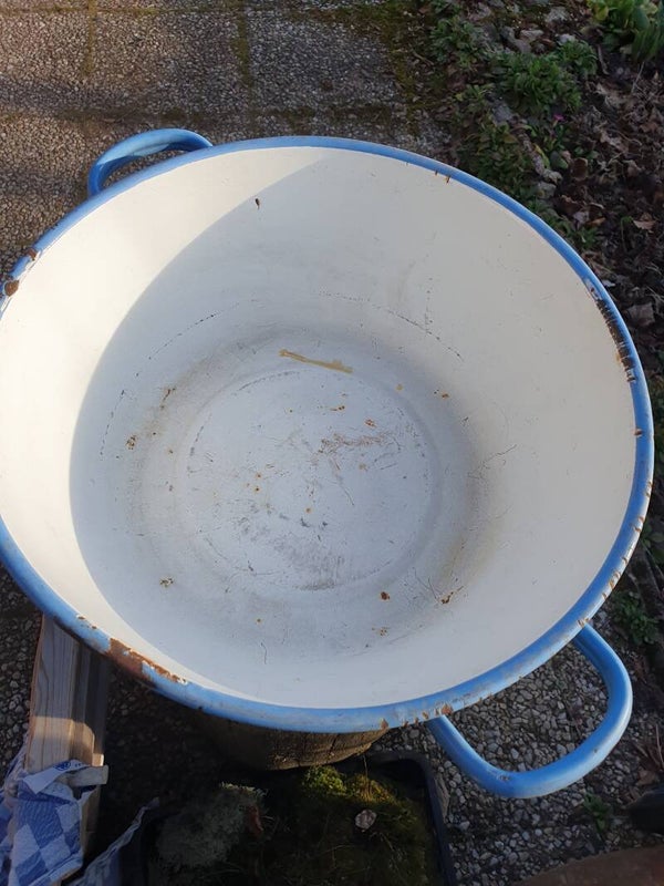 Grote teil of bak van blauw emaille met een witte binnenkant. De bak is 37 x 15 cm.