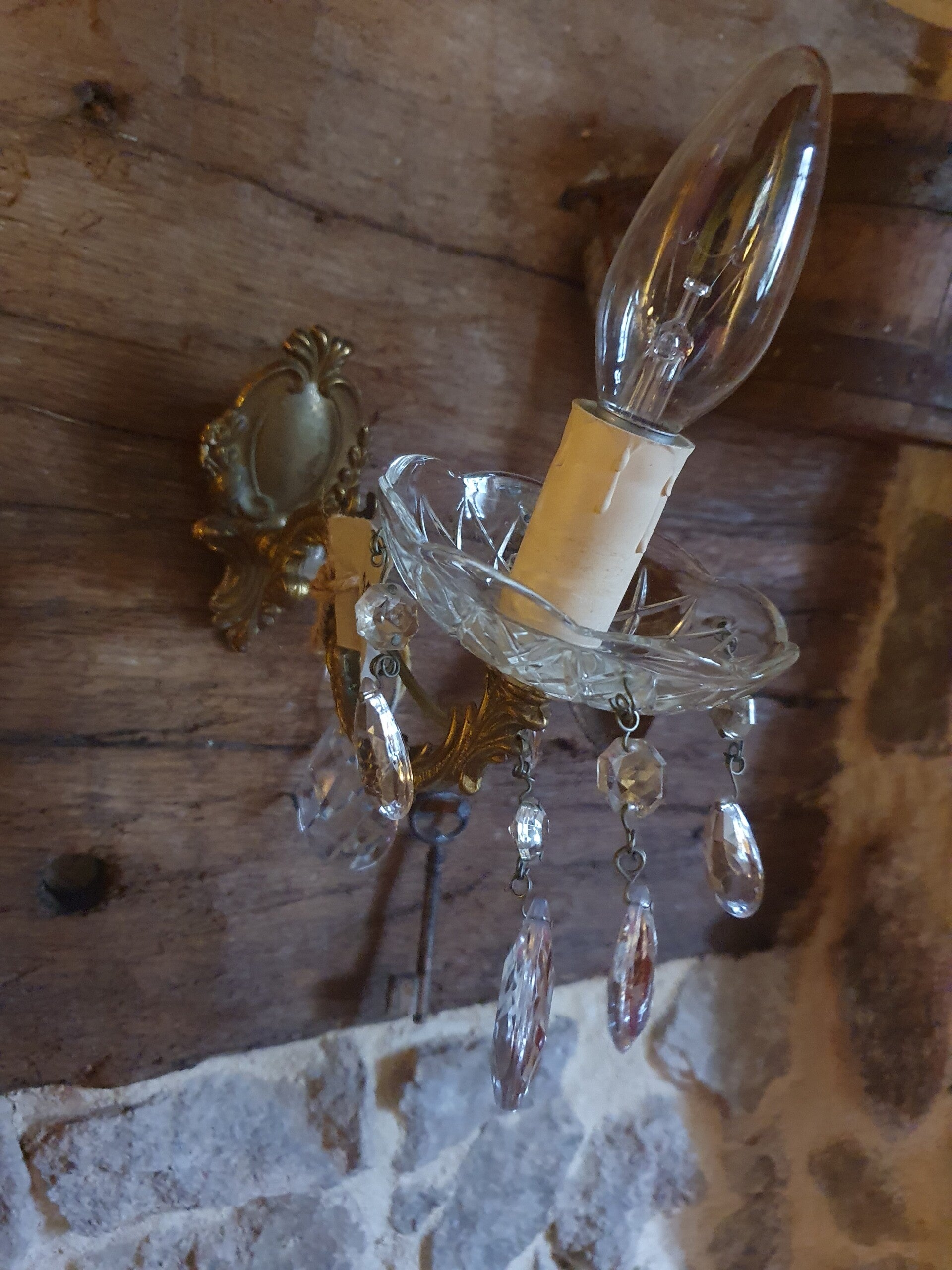 Antiek Frans wandlampje met glazen ring en pegels en een sierlijke brons vergulde beugel.