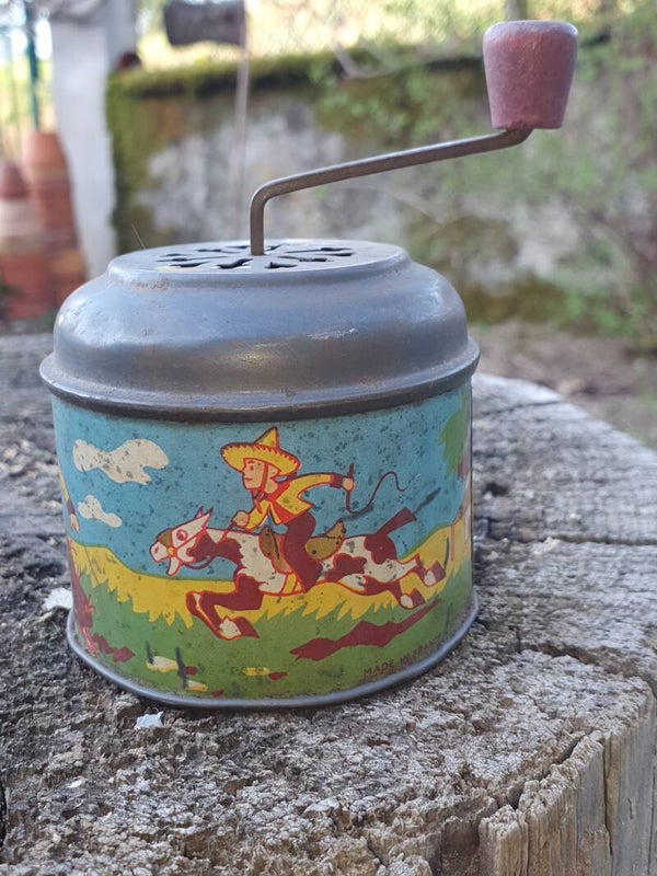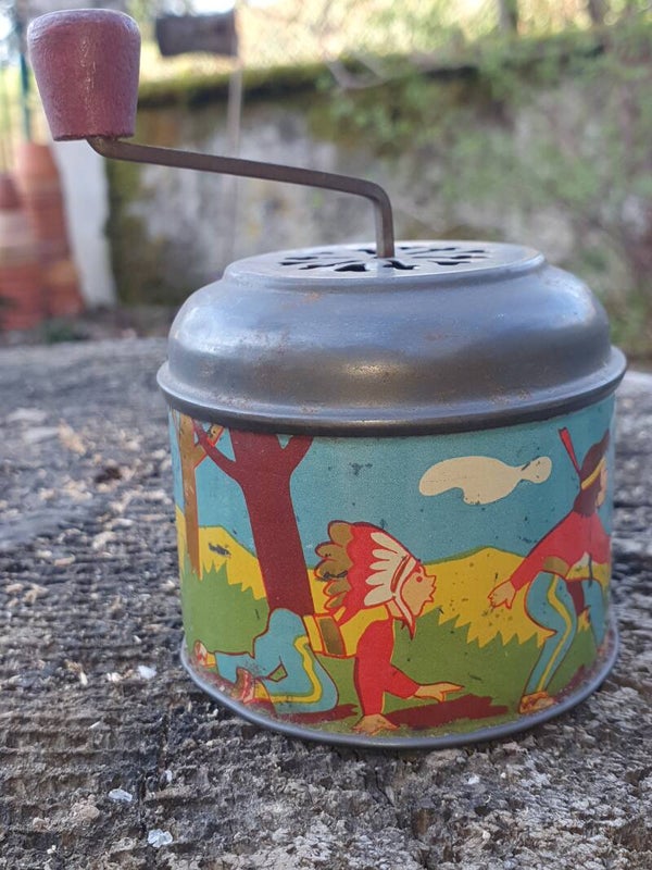 Antiek muziekmolentje met een verhaaltje van een cowboy en indianen uit 1950. Werkt goed.