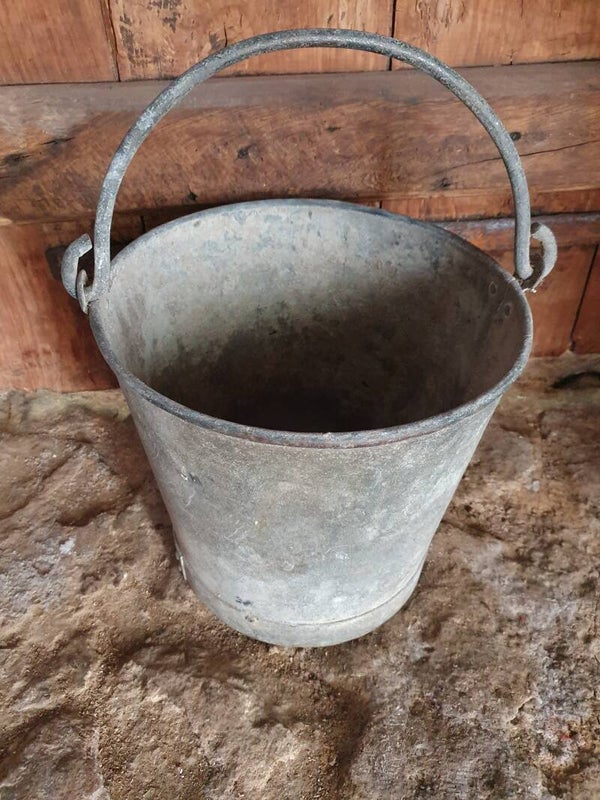 Zware zinken emmer met robuuste handgreep.