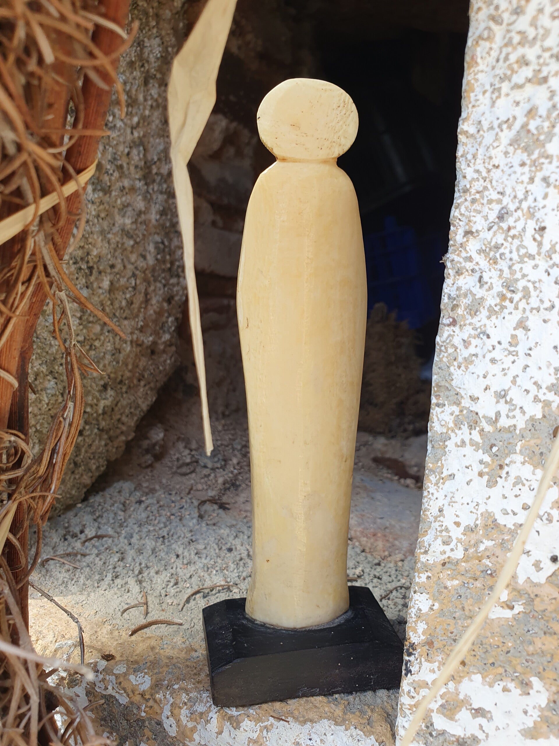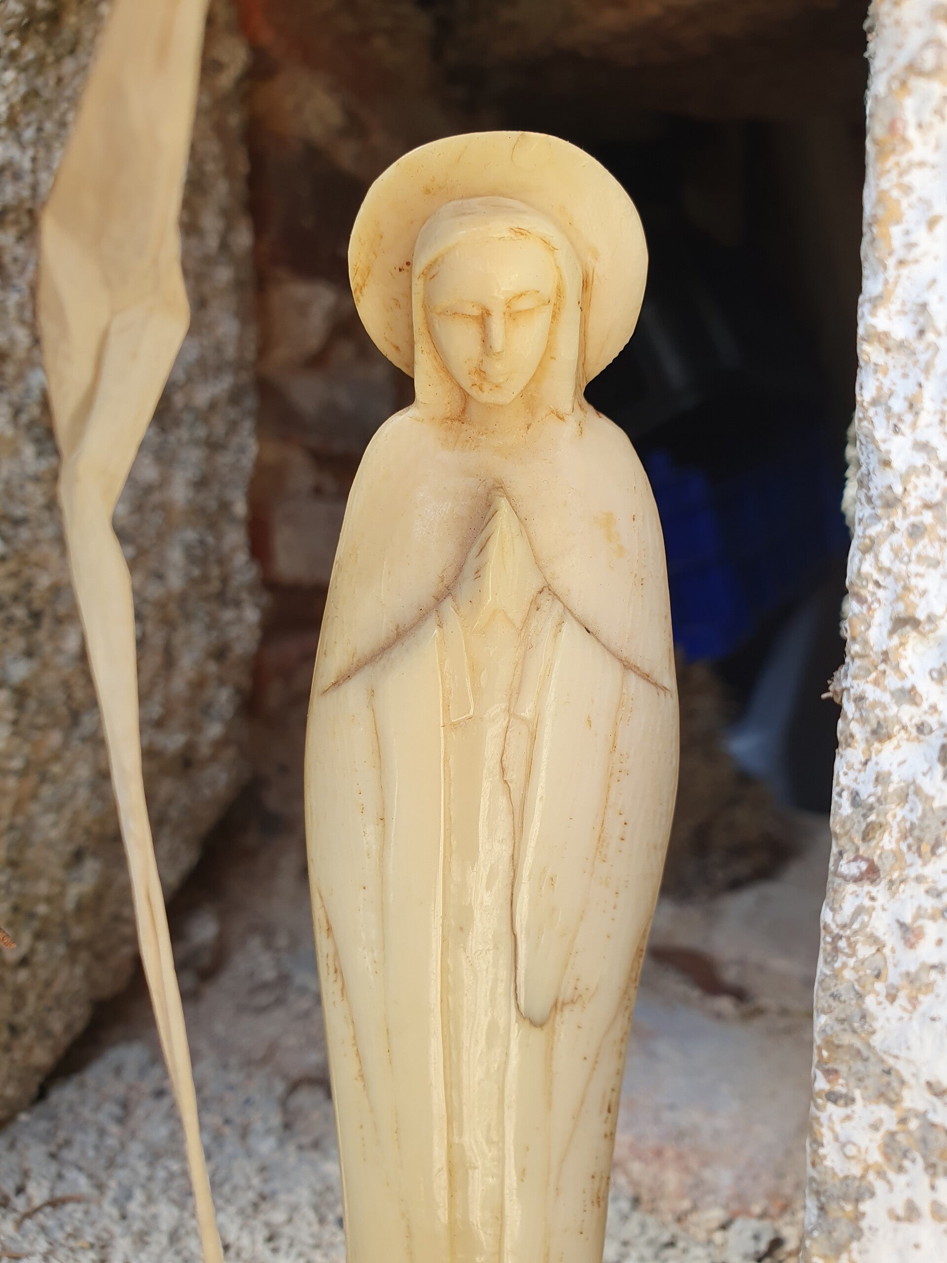 Antiek Mariabeeld, gesneden van been of hoorn van 15,5 cm hoog op een zwart houten voetstuk.