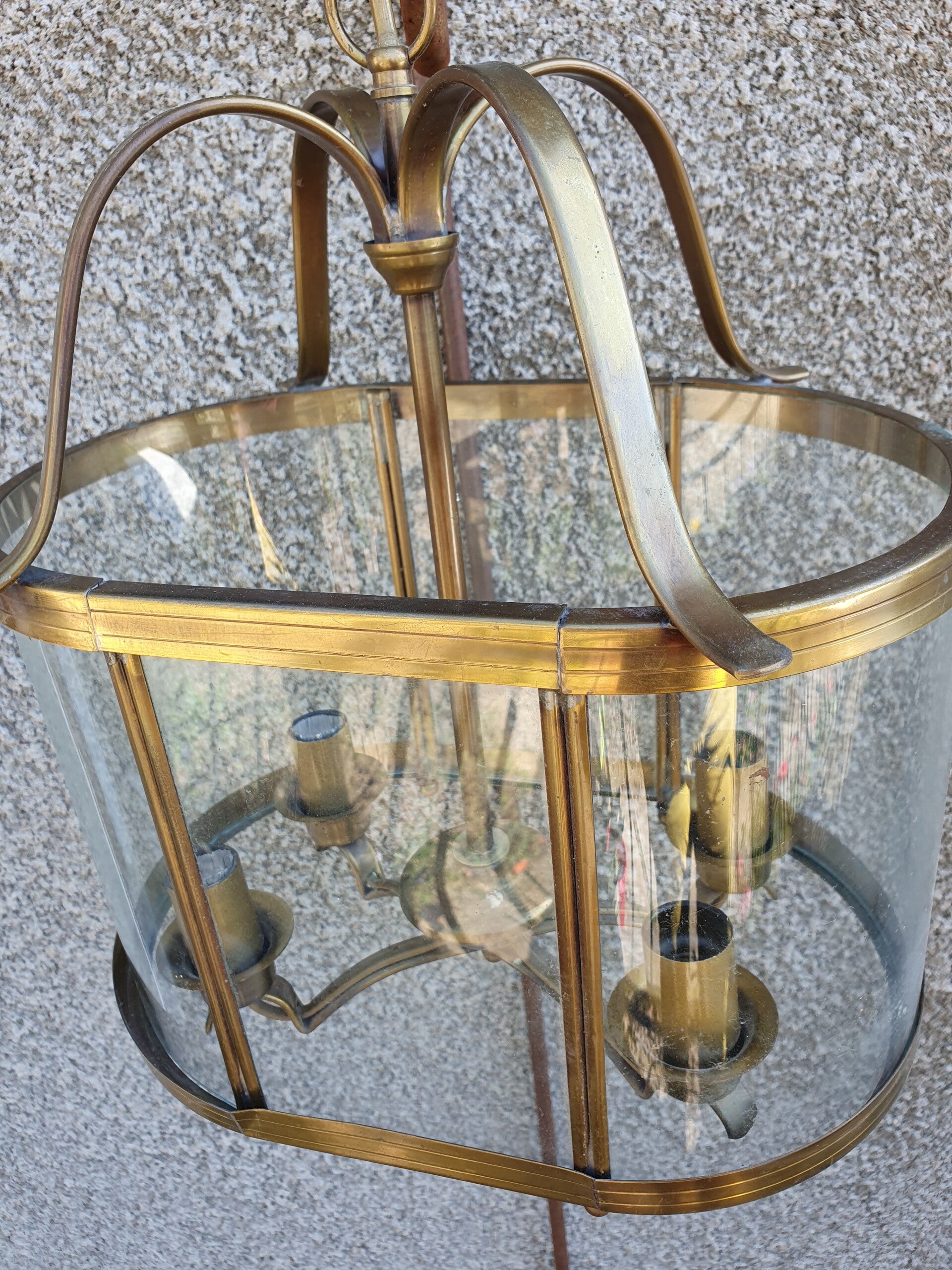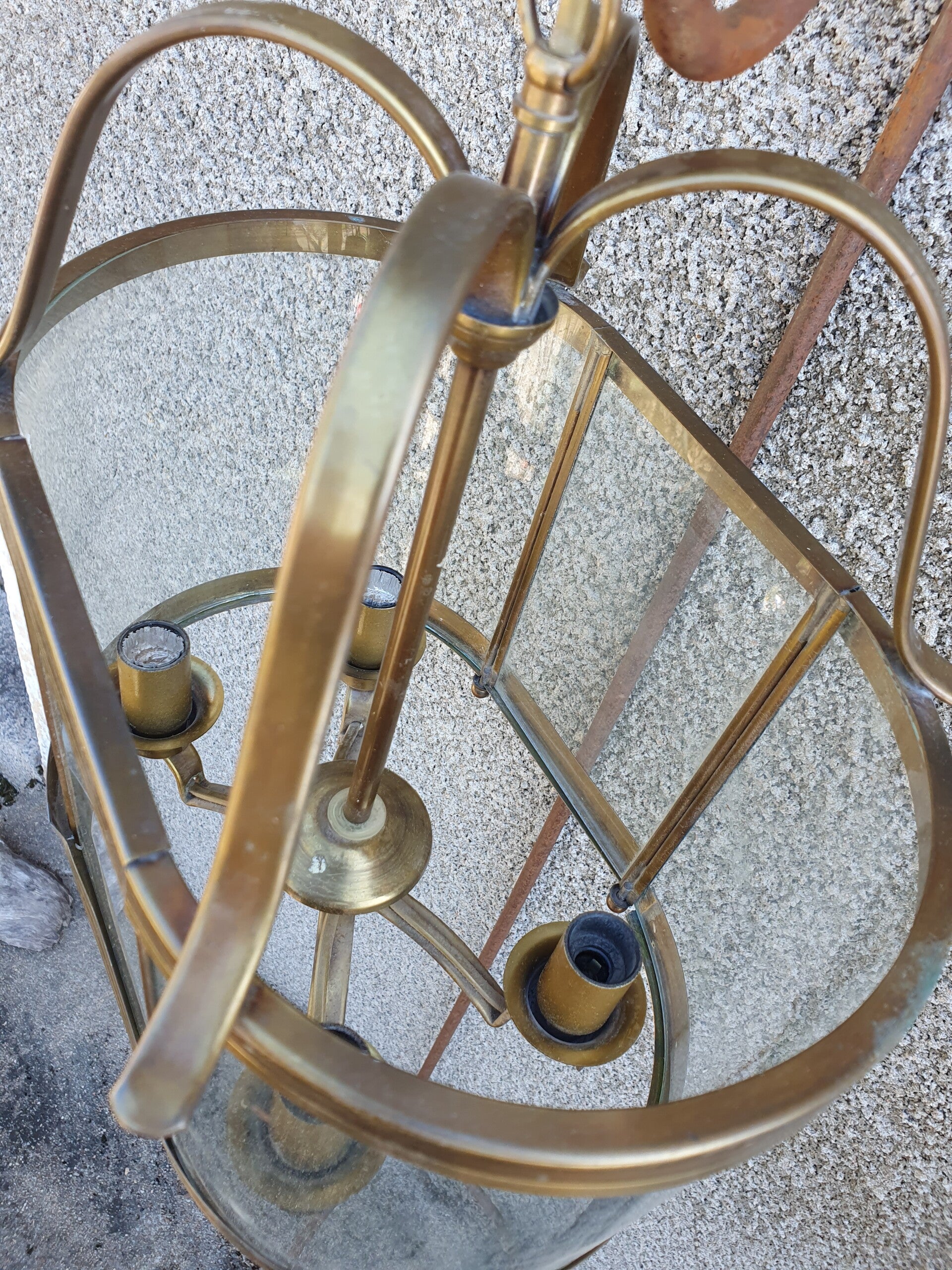 Prachtige antieke ovale hallamp van gebogen glas gezet in messing uit ca 1960!