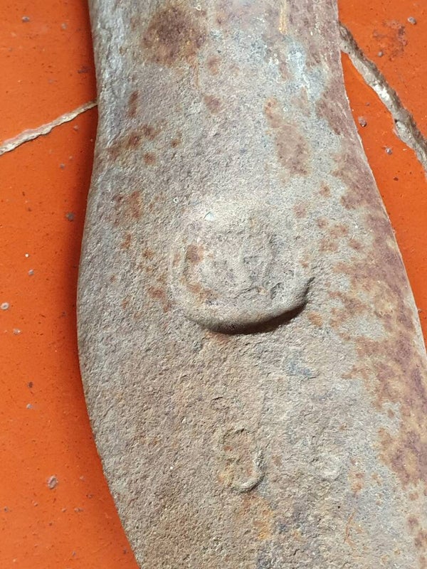 Decoratief houten been / laarzen mal met zware metalen voet van 58 cm hoog maat 6 of 9 en een merk stempel in het metaal.