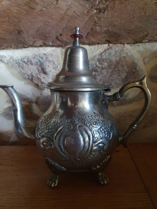 Mooi bewerkte vintage verzilverde theepot van 1 liter uit Marokko, gemerkt nr. 8.