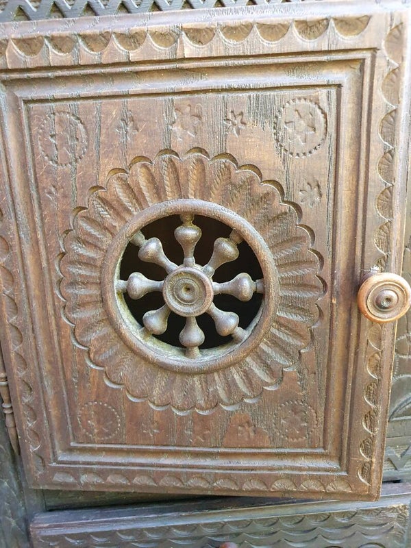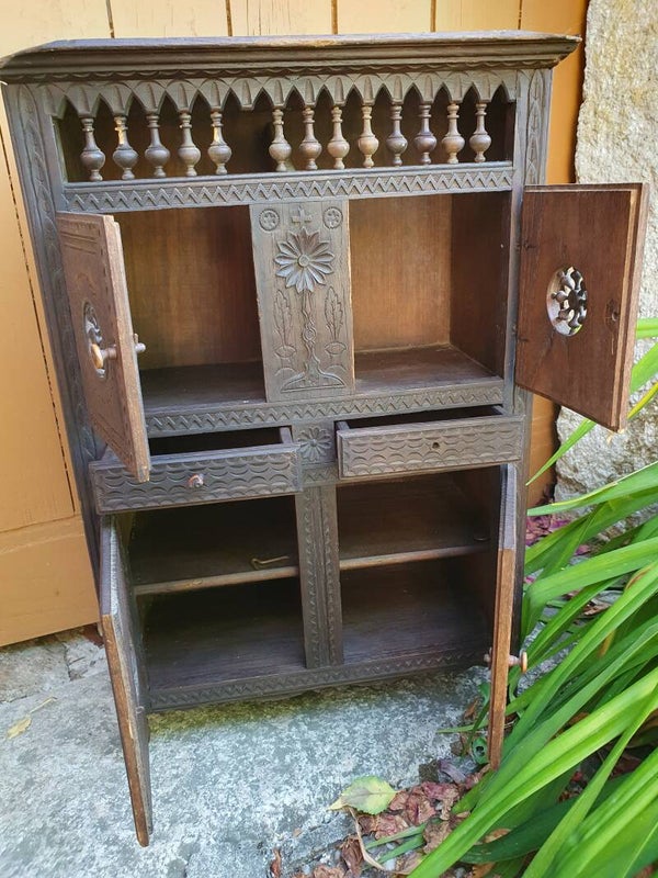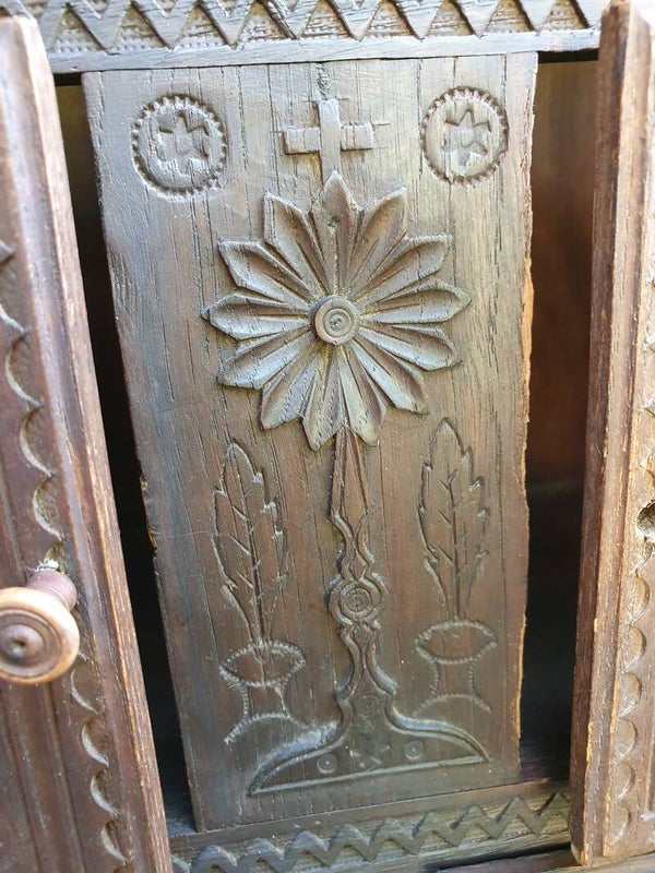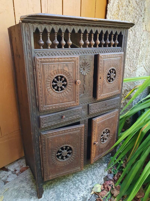 Antiek Bretons miniatuurkastje uit ca 1920 met 4 deurtje en 2 laatjes. Bijzonder stukje handwerk en vakmanschap! Afmetingen 33, x 16 x 50 cm.