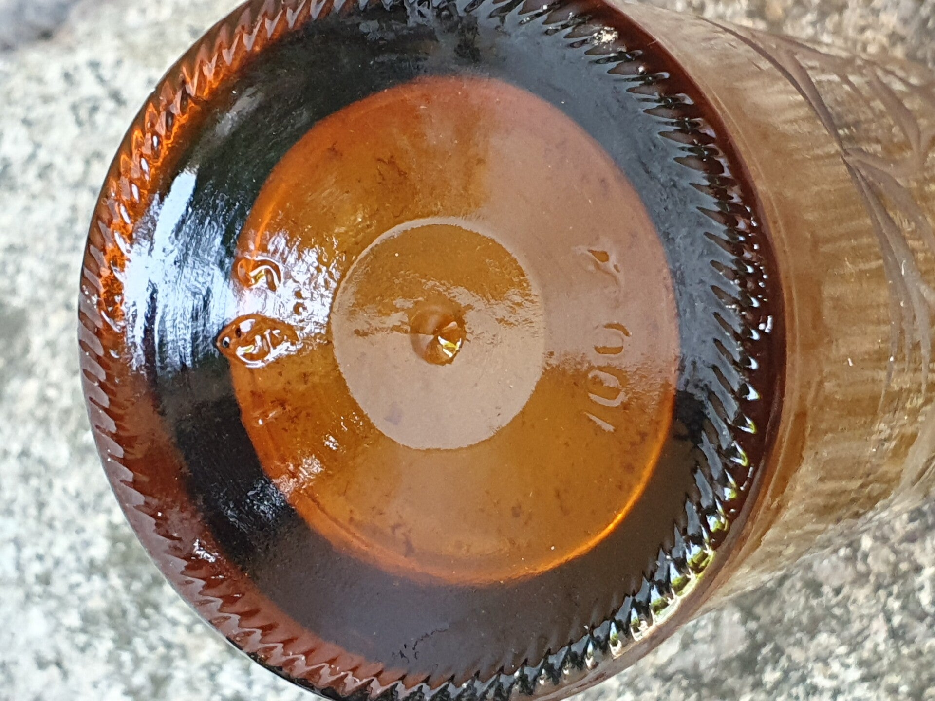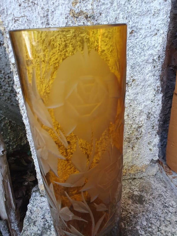 Vintage vaas van bruin glas met gegraveerde rozen. De vaas heeft een inhoud van 1 liter en is gemerkt. Een klein chipje aan de bovenkant. De vaas is 23,5 cm hoog met een opening van 8 cm