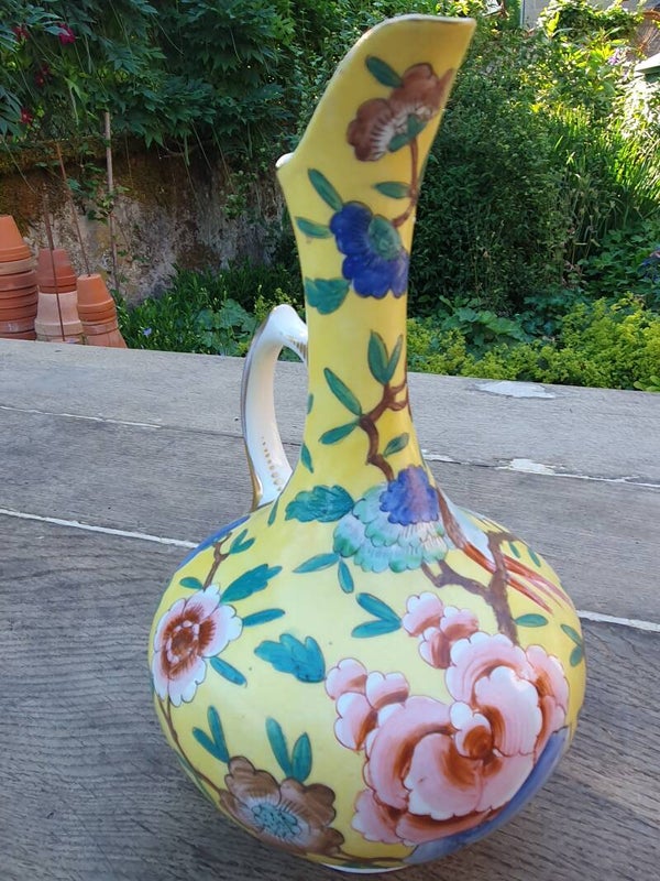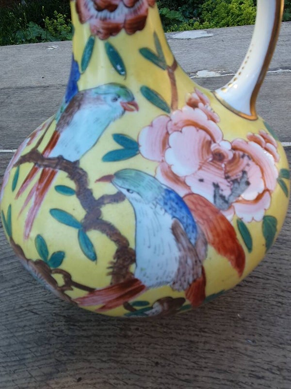 Mooie antieke en chinese vaas met afbeeldingen van bloemen en vogels in heldere kleuren. De vaas is 27 cm hoog met een handgreep. De vaas gemerkt.