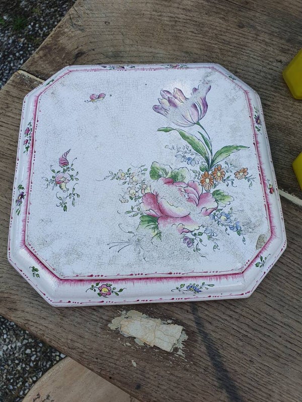 Mooie antieke handgeverfde aardewerk onderzetter van Clamey met een florale afbeelding, genummerd 142. Maat 22 x 22 cm.