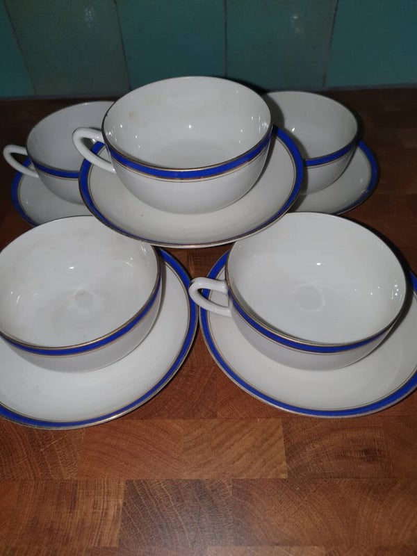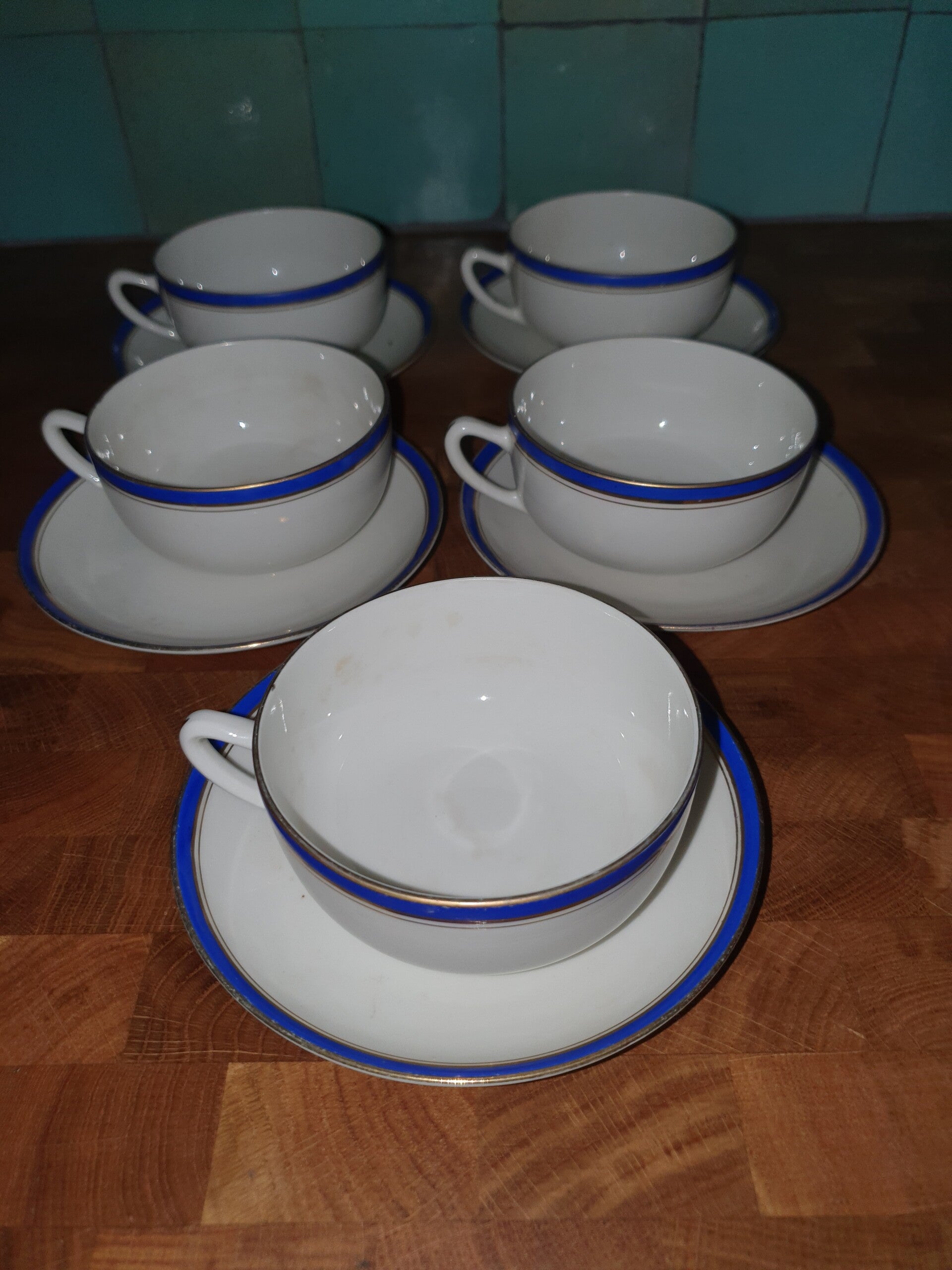 5 Porseleinen kop en schotels met een blauwe en gouden rand.