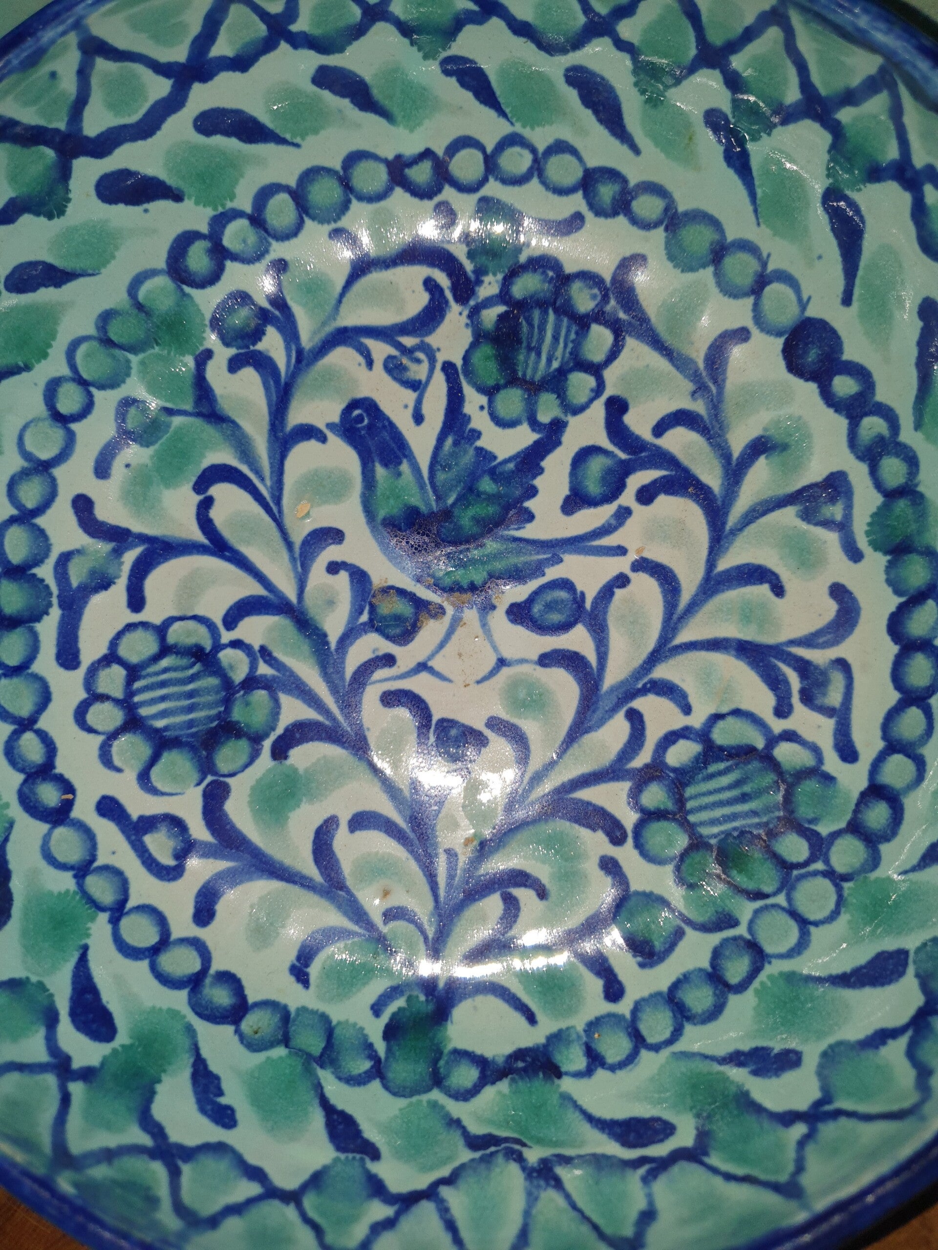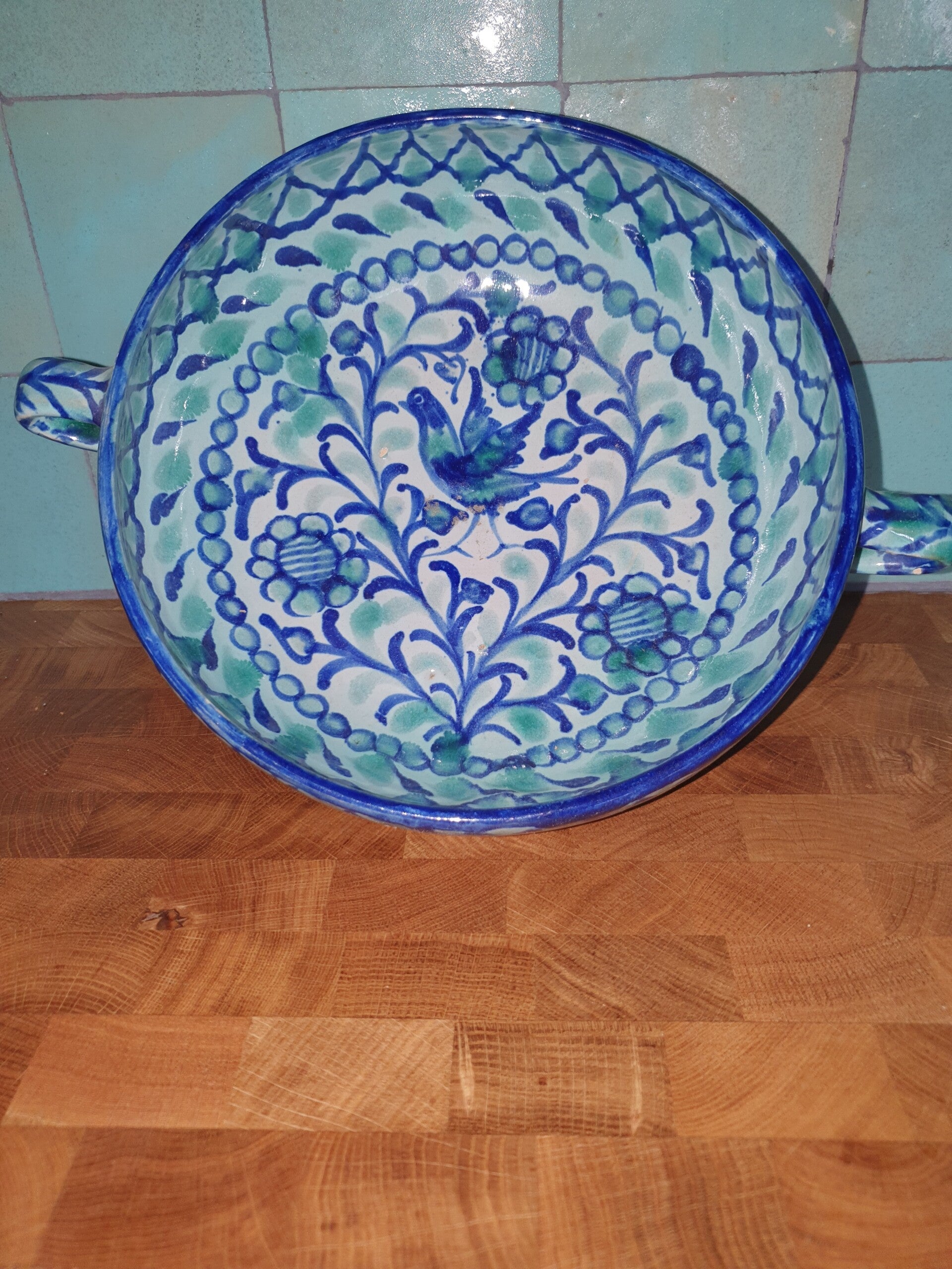 Mooie spaanse schaal in kobaltblauw en turkooise met oren. De schaal is gemerkt nummer 4, is 7,5 cm hoog en meet 22 cm doorsnede.