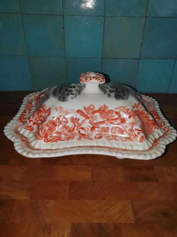Prachtige dschaal met deksel van Copeland Spode England met rijke decoraties in oranje en zwart van gestileerde bloemmotieven en kastelen.
