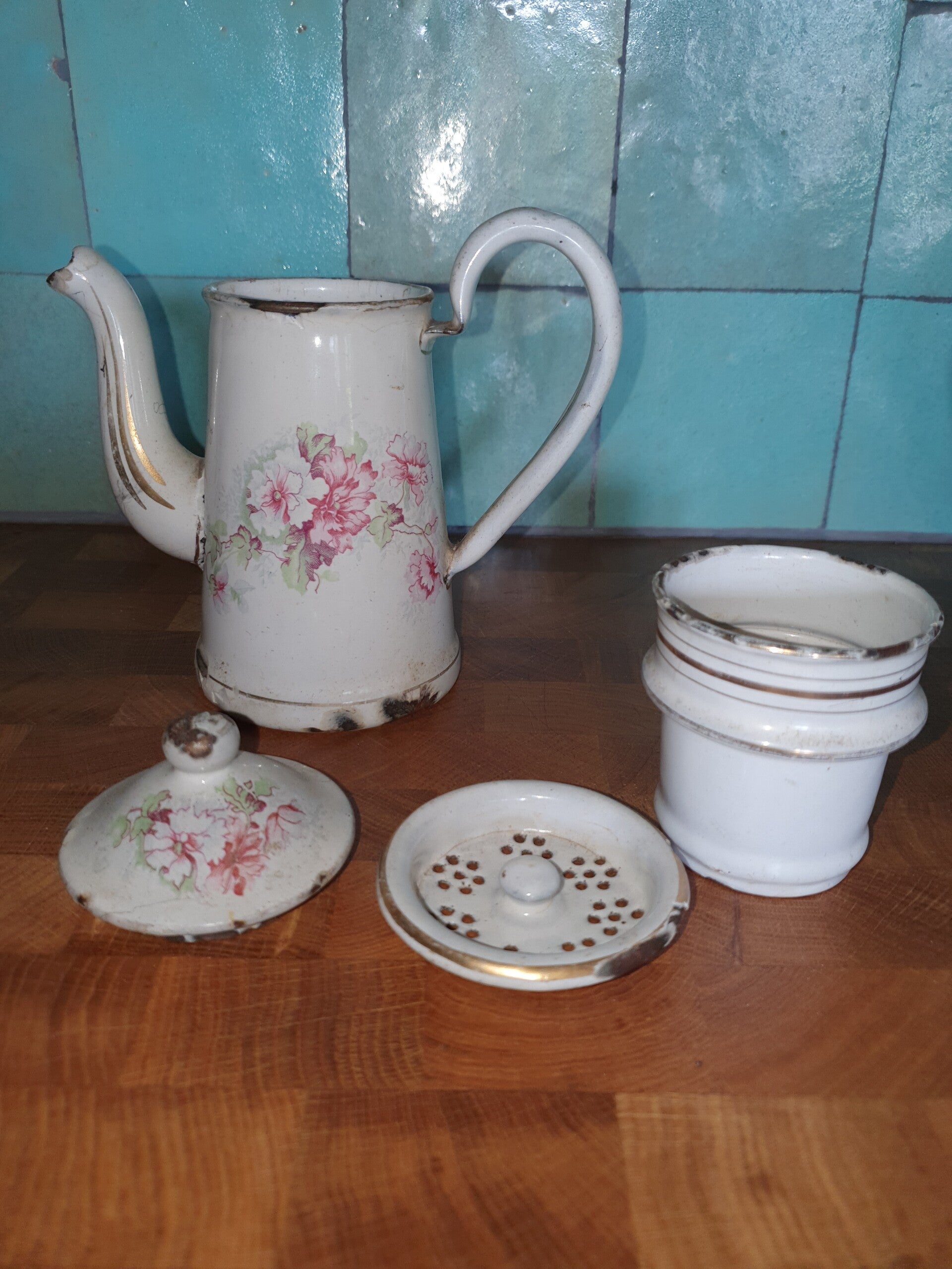 Heel lief klein brocante emaille koffiepotje met filter en een zeefje. Het witte emaille is gedecoreerd met een Clematisbloem en gouden biezen, Goed voor 2 of 3 kopjes koffie.