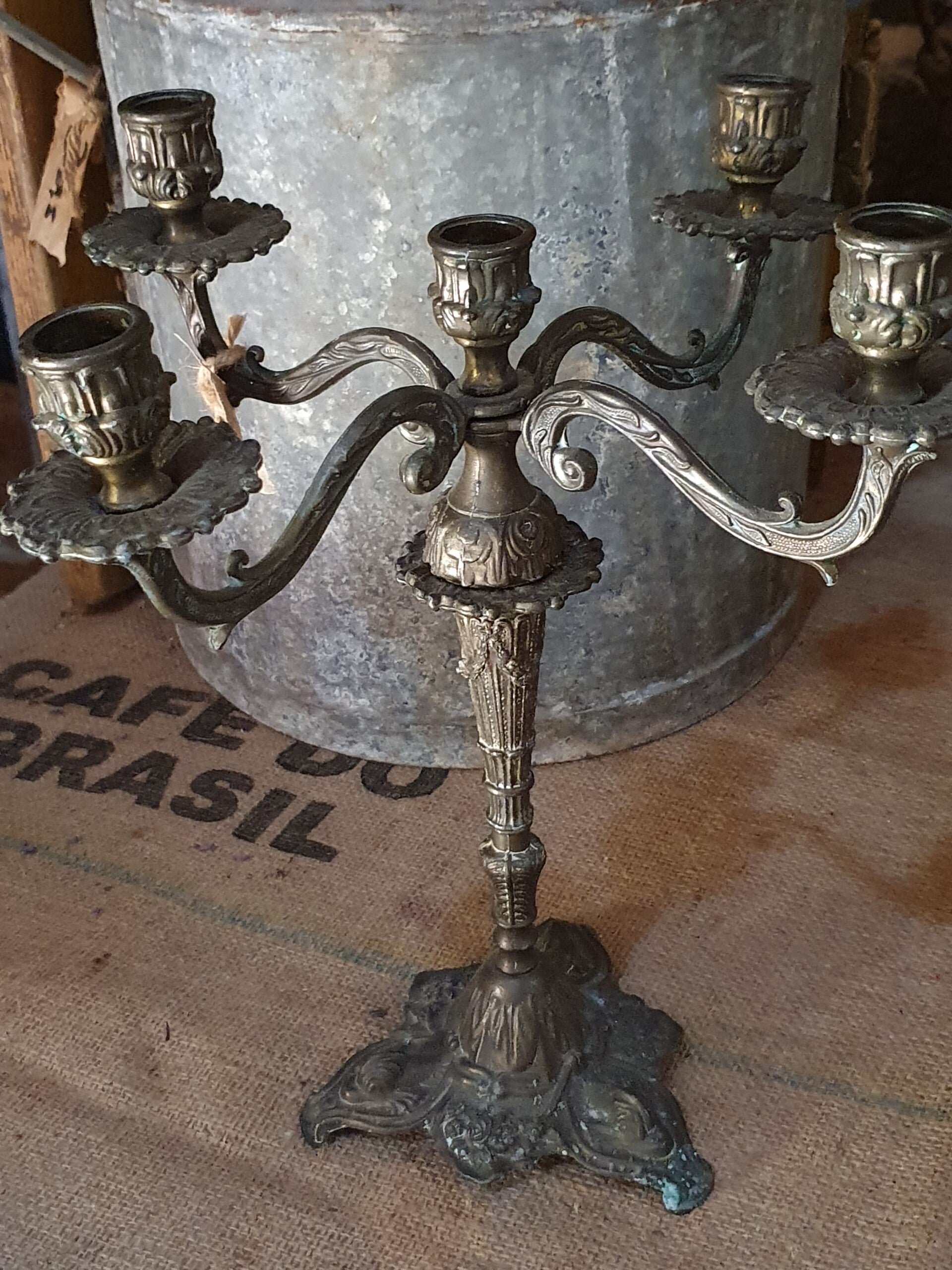 Mooie oude en zware bewerkte messing kandelaar met 4 armen. Geeft altijd een feestelijk licht. De kandelaar is 35 cm hoog.