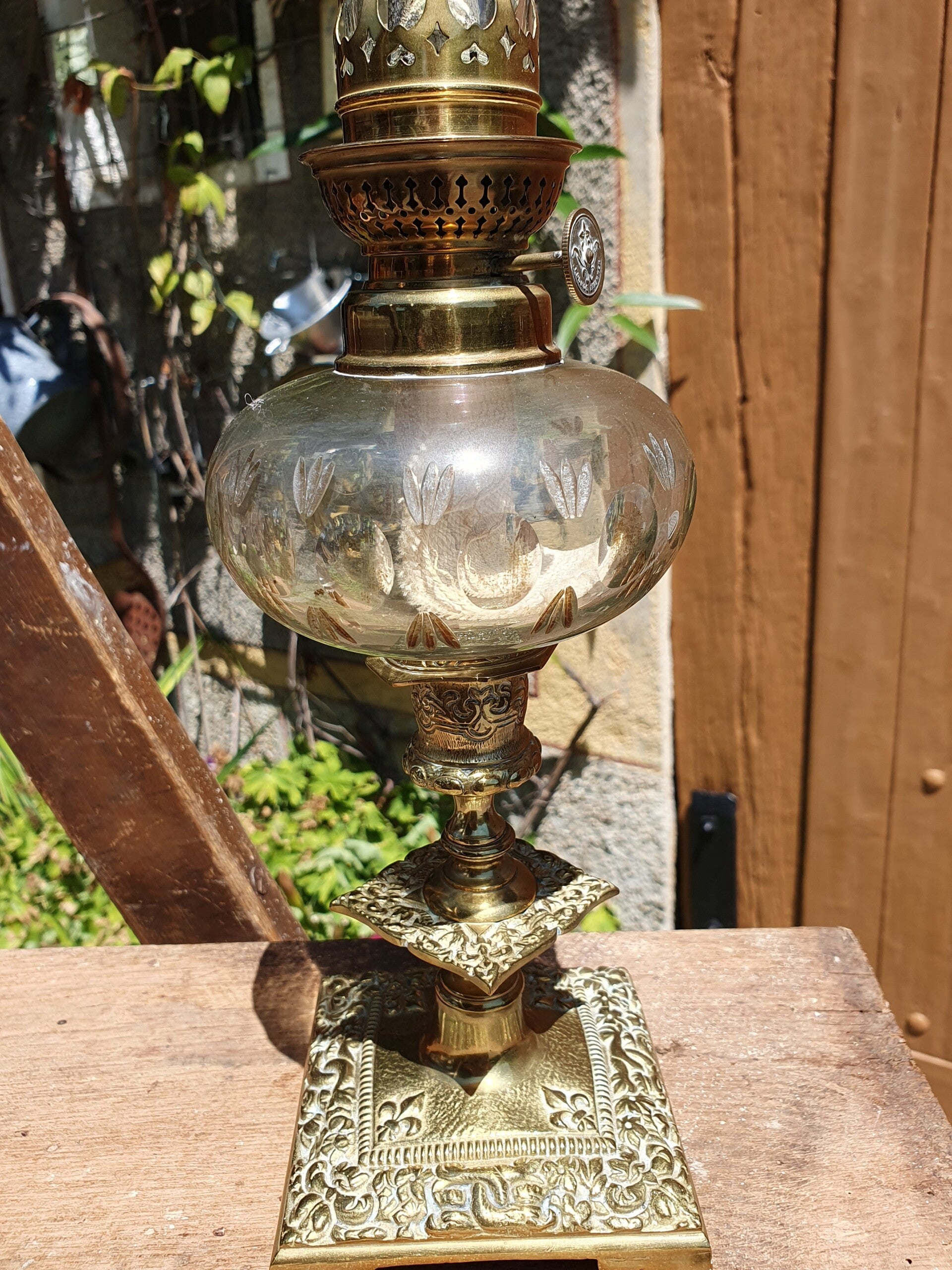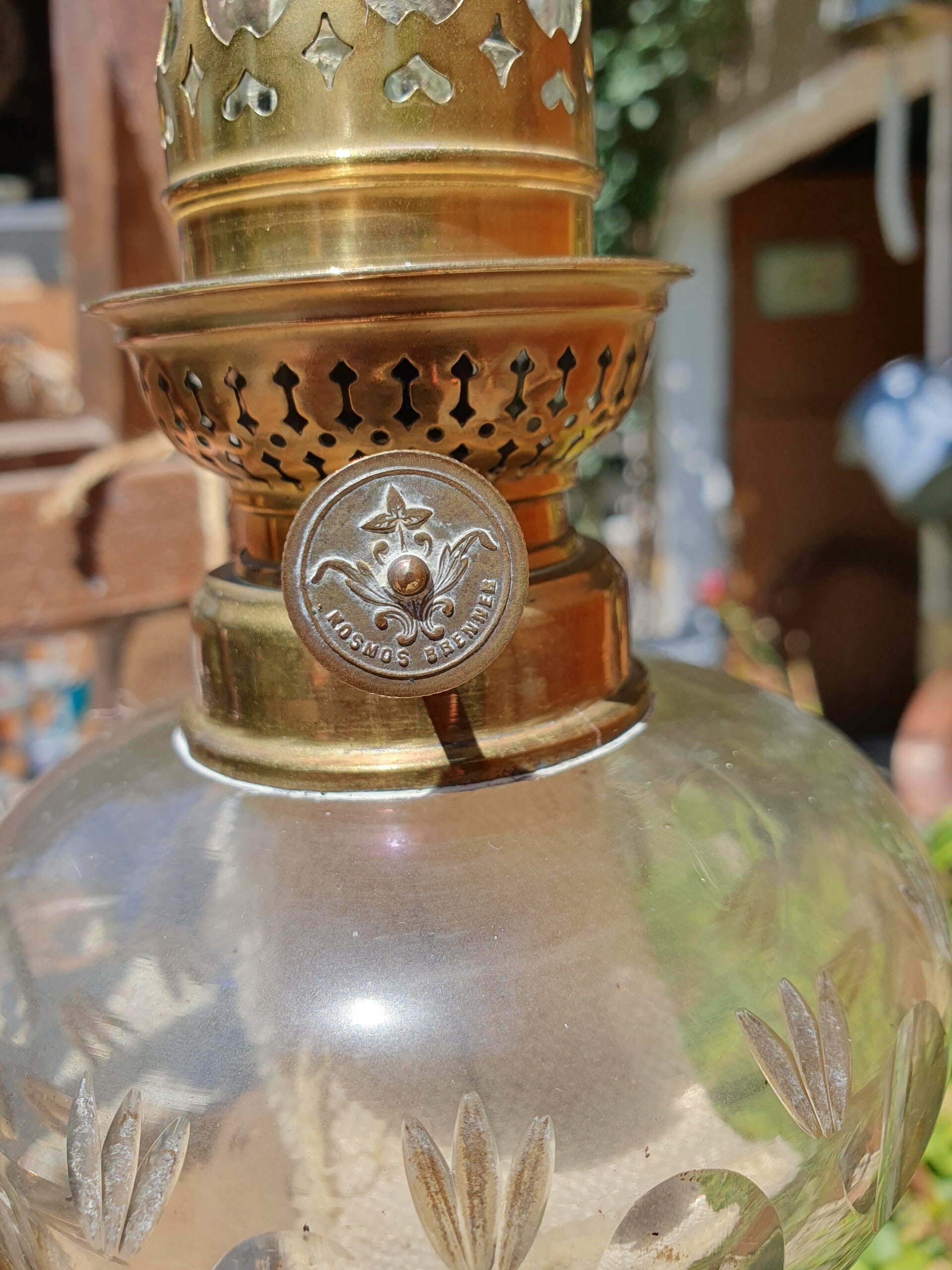 Antieke olielamp van helder gegraveerd glas en bewerkt messing een Kosmos Brenner. Wild & Wessel uit Berlijn introduceerden in 1865 het idee van een platte pit, gevouwen tot een ronde vlam, later de Kosmos-brander genoemd. (bron:www.lumieredeloeil.com)