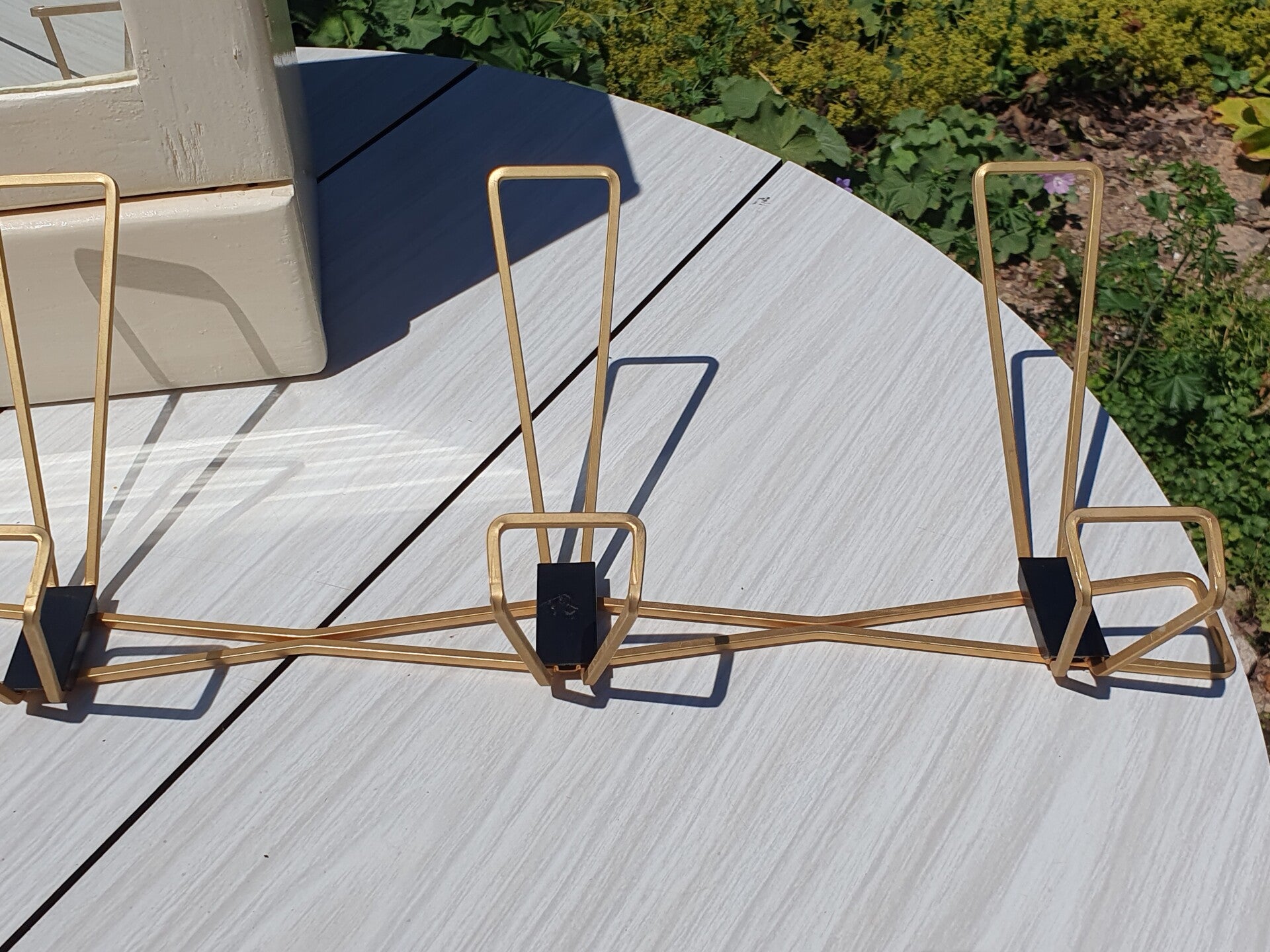 Vintage goudkleurig metalen kapstok met 3 haken uit de jaren 70. De schroeven zitten achter de zwart plastic doppen. Lengte 47,5 cm.