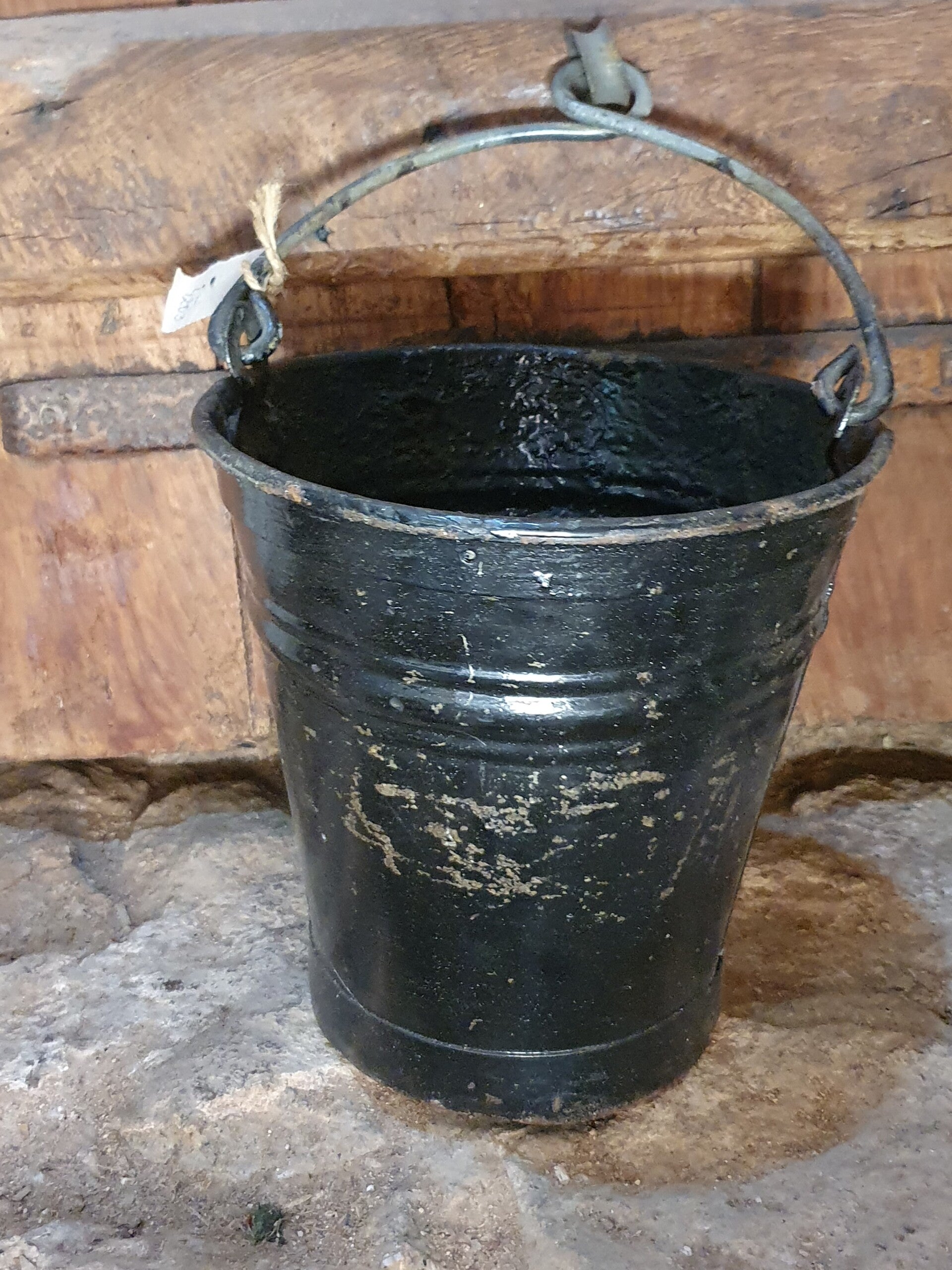 Zware zwarte zinken emmer van 25 cm hoog en 25 cm doorsnede met een speciaal gevormd hengsel en een oog voor een touw.