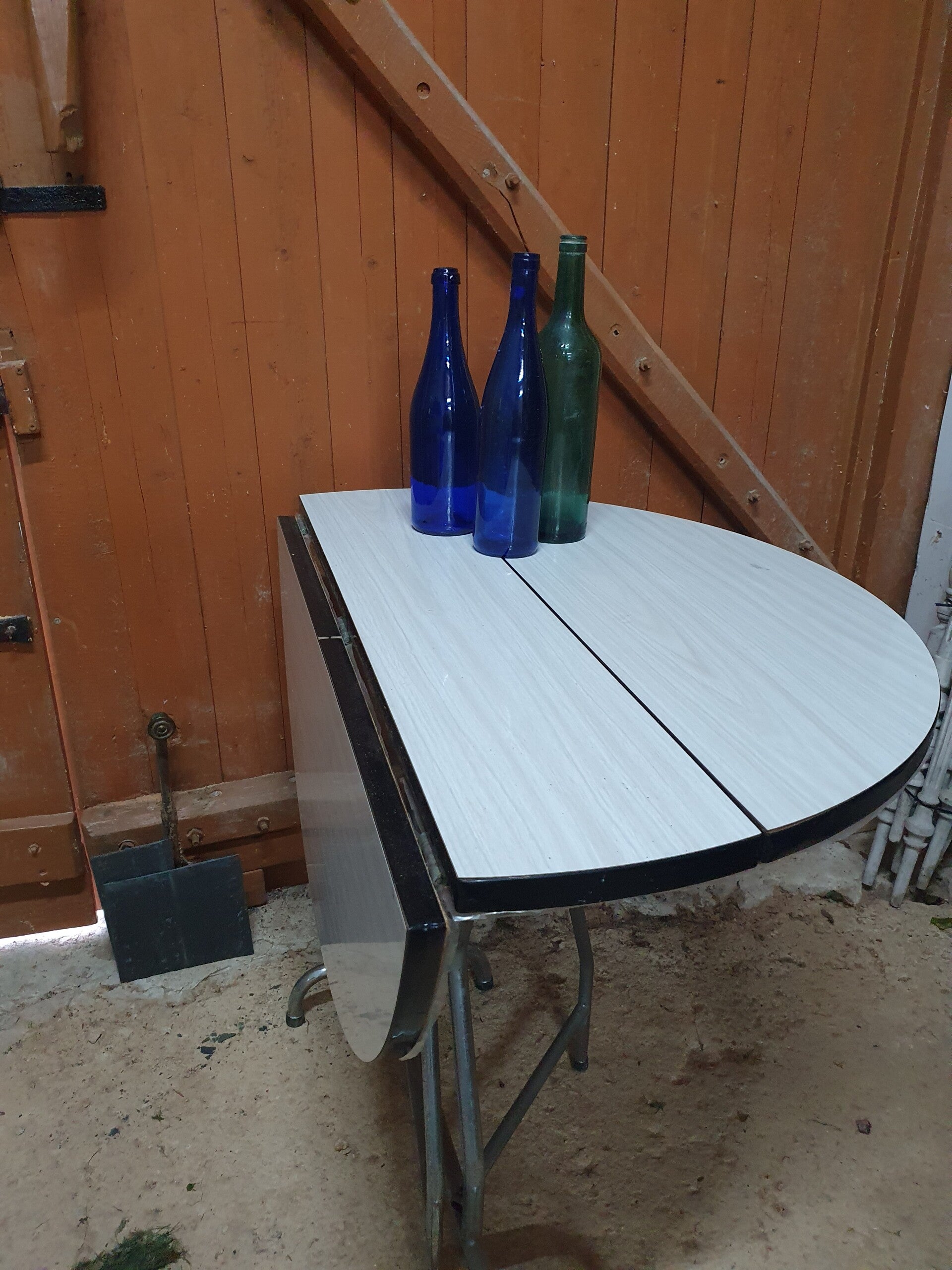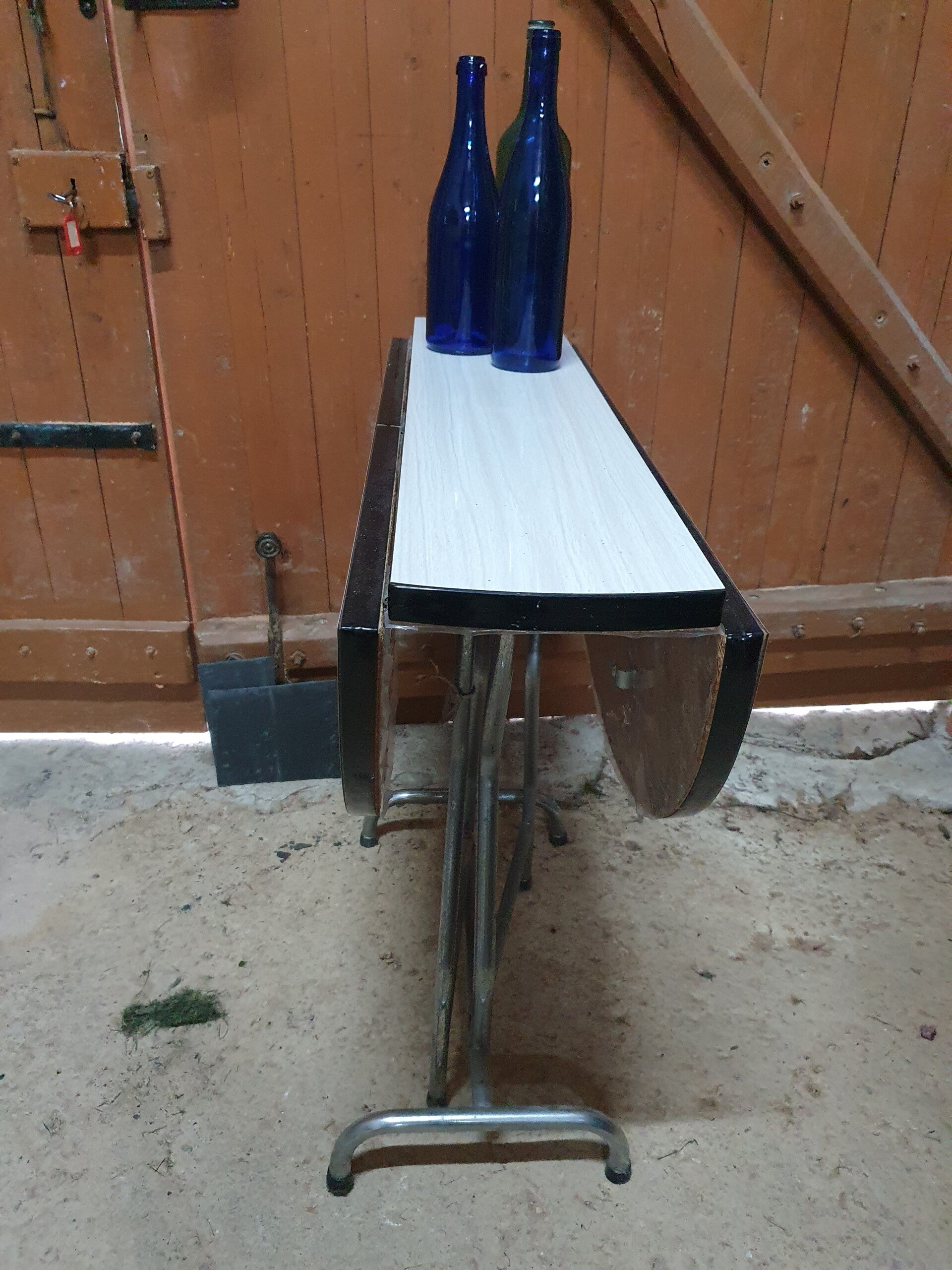 Gave ronde vintage formica vouwtafel. Reuze handig! Je kunt hem smal maken, 19 x 90 cm als je hem niet nodig hebt, 1 blad uitklappen als je meer ruimte nodig hebt en beide bladen uitklappen 89 x 90 cm als je visite krijgt bijvoorbeeld. De hoogte is 77 cm. Het blad rust op een stevig metalen onderstel met weg klapbare poten.