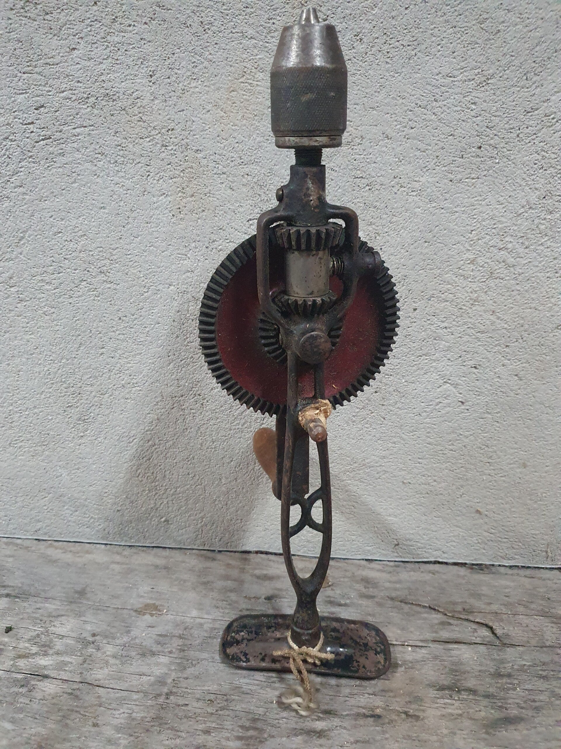 Zware antieke handboor Val D'Or nummer 6, Frans fabrikaat. Let op het mooie mechanisme, wat bij deze boor duidelijk zichtbaar is.