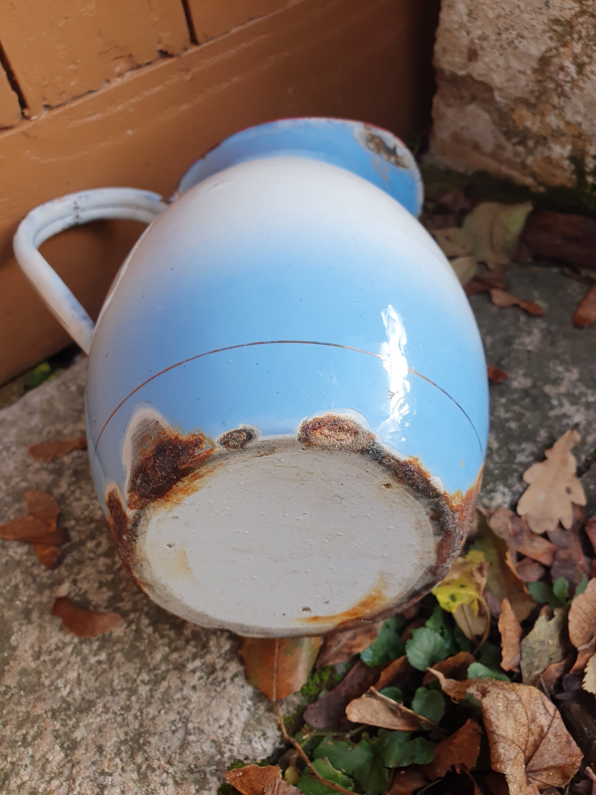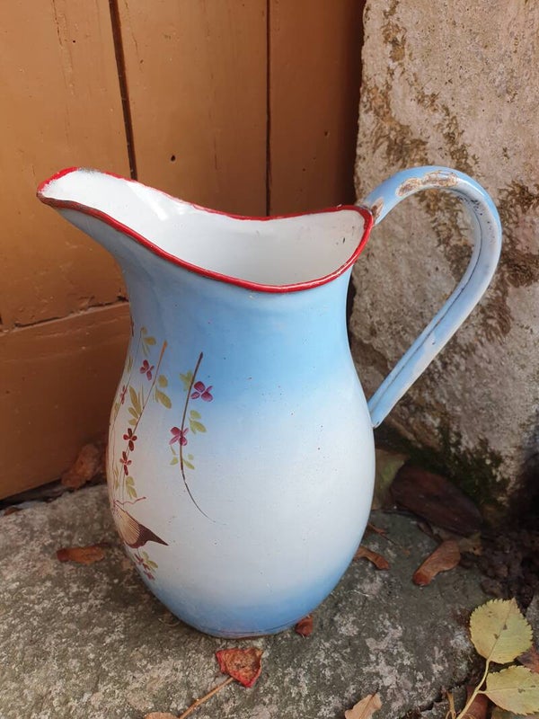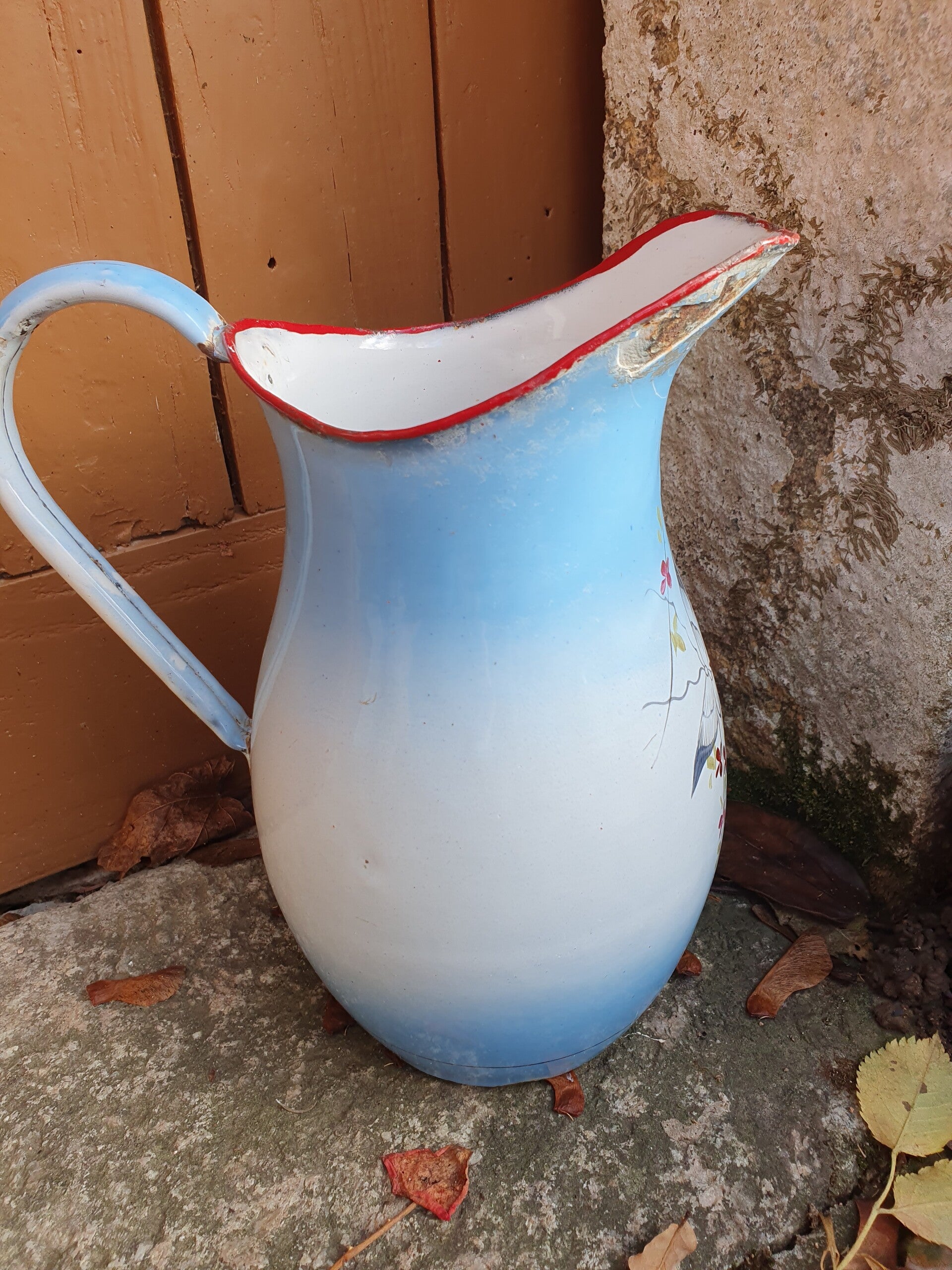 Je vindt ze niet zo vaak hier in de Morvan; deze mooie sierlijke emaille kannen. Deze is wel heel mooi met zijn decoratie van vlinders en bloemenranken.
